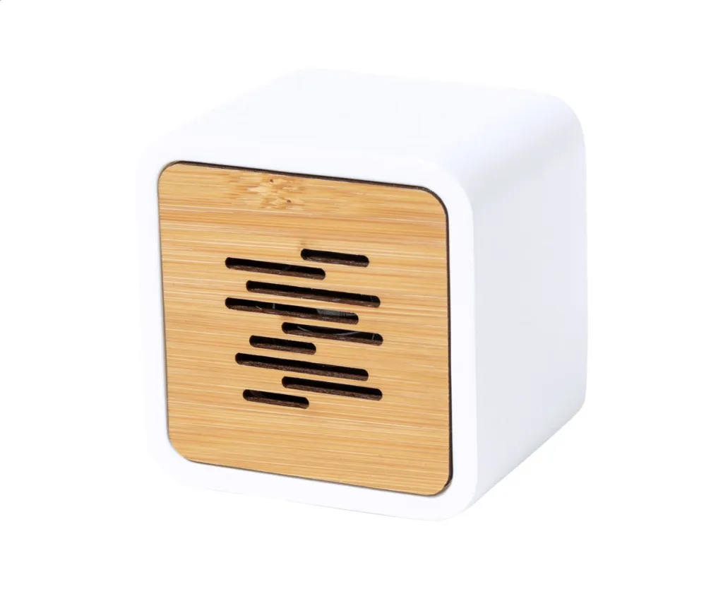 Bluetooth speaker in PLA plastic and bamboo housing. With hands-free call function and built-in rechargeable battery. Including USB charger cable. Plastic parts are 100% compostable PLA.