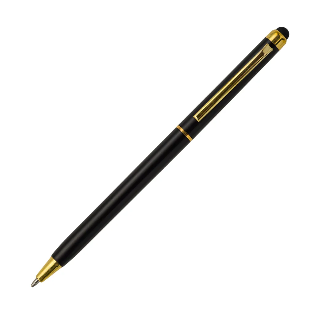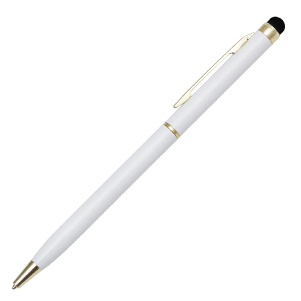 Ballpen with a tip designed to work with touch screen devices. Plastic barrel, metal clip. It comes with blue refill. Rotation switching on mechanism.