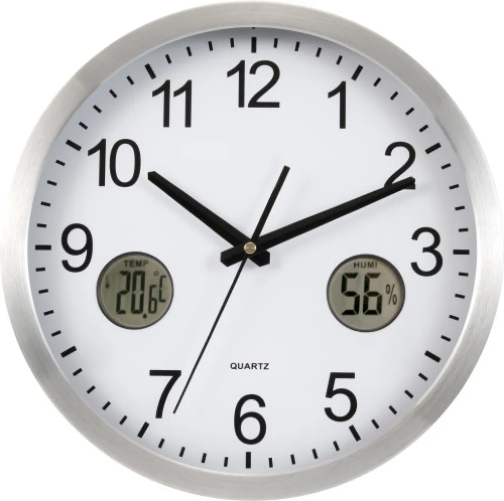 Plastic wall clock with a smooth turning second hand, and two digital functions on the dial plate; an indoor thermometer, and a hygrometer. Batteries included. Sold per 10 pieces.
