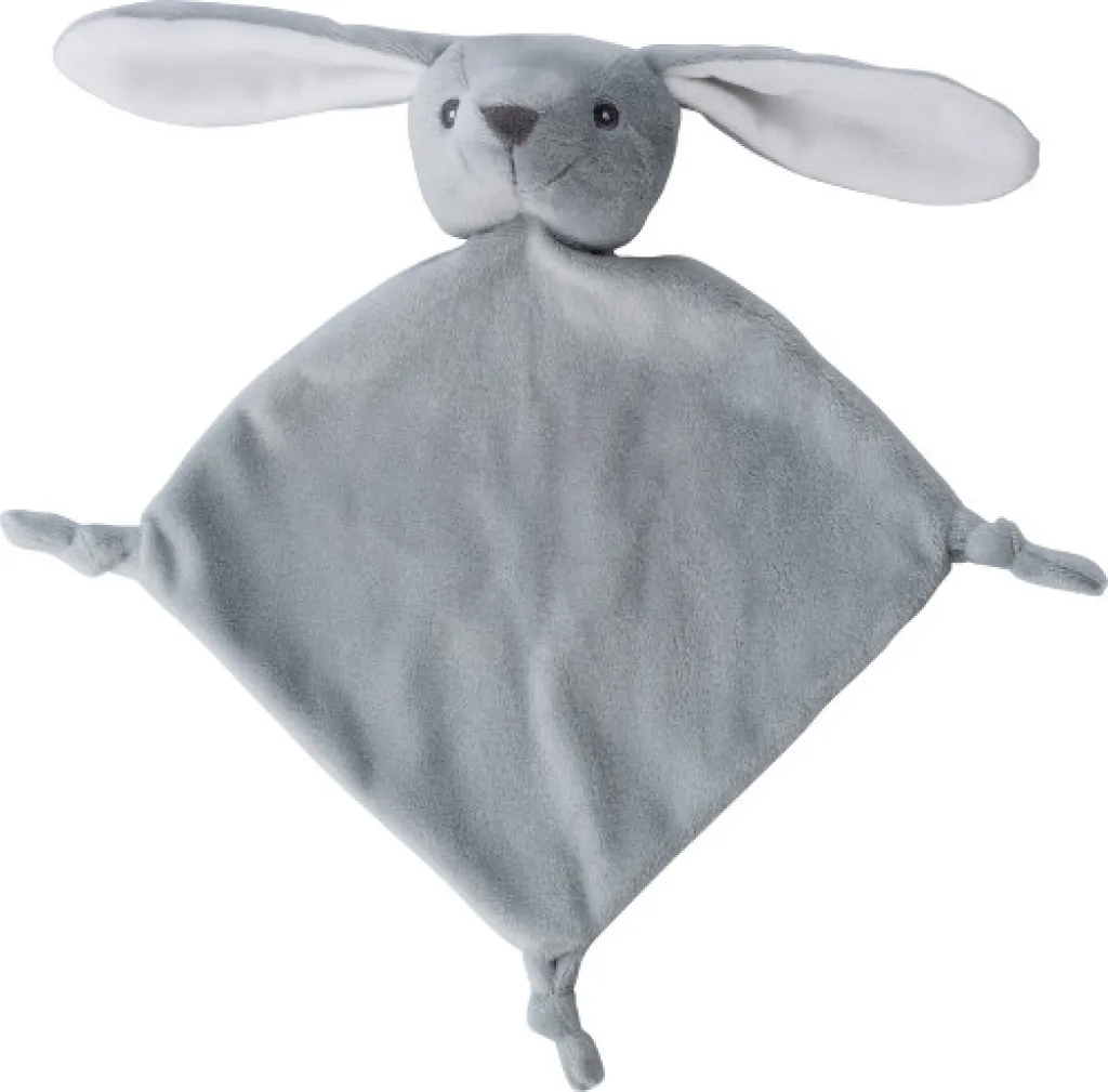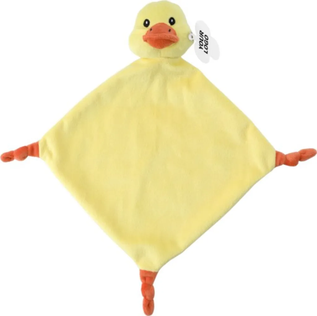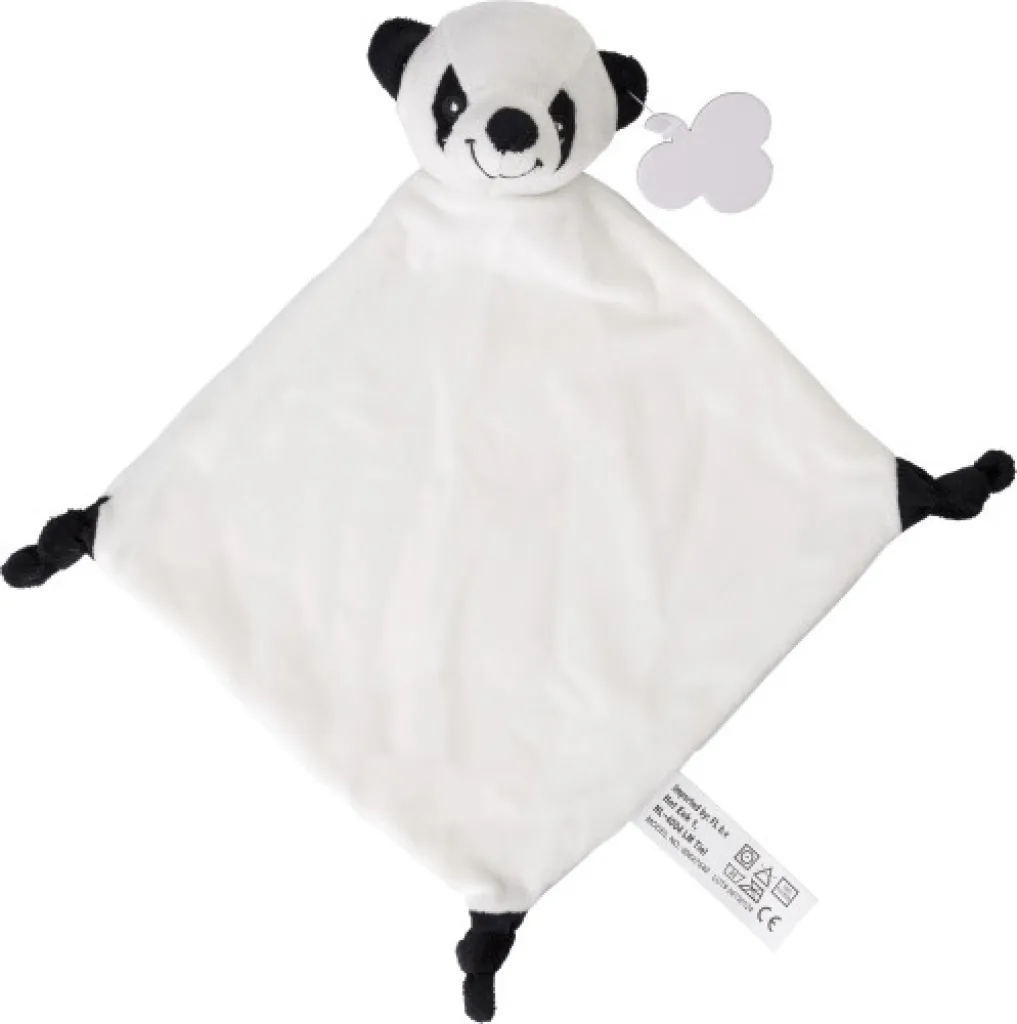 Plush cloth with knots at three corners and an animal head on the fourth corner. Includes a tag for printing.