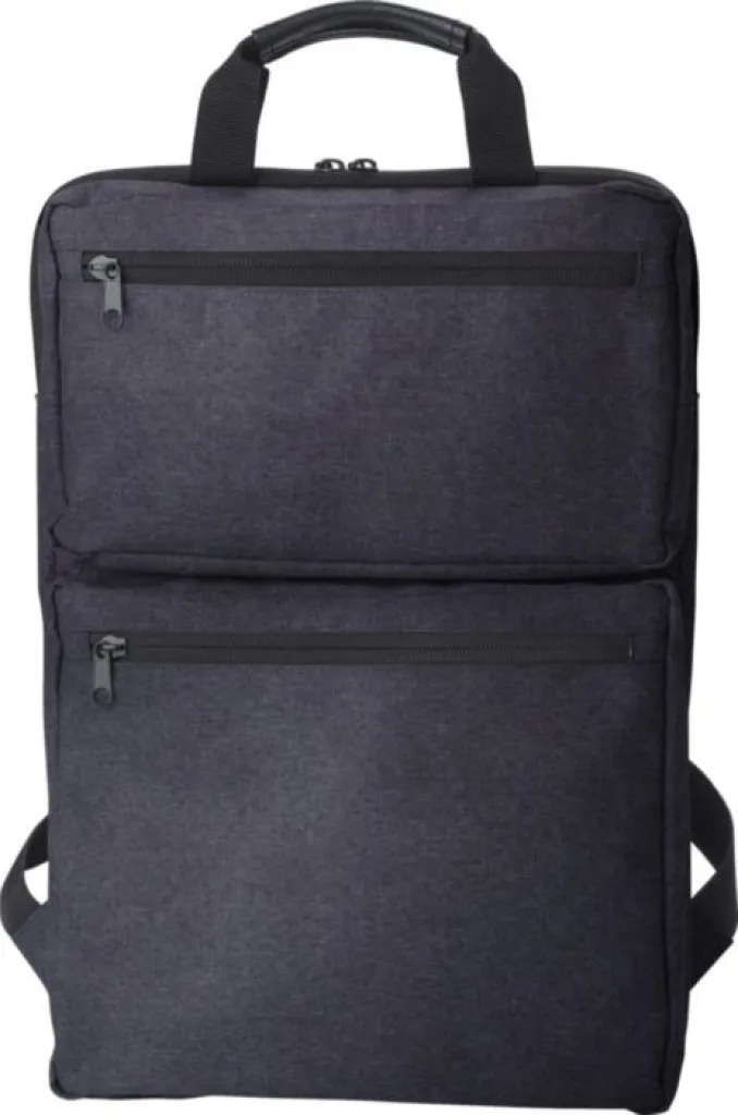 Polycanvas (300D) backpack with two outside pockets with zipper, and laptop compartment inside (15 inch). With padded shoulder straps and two short handles on top.