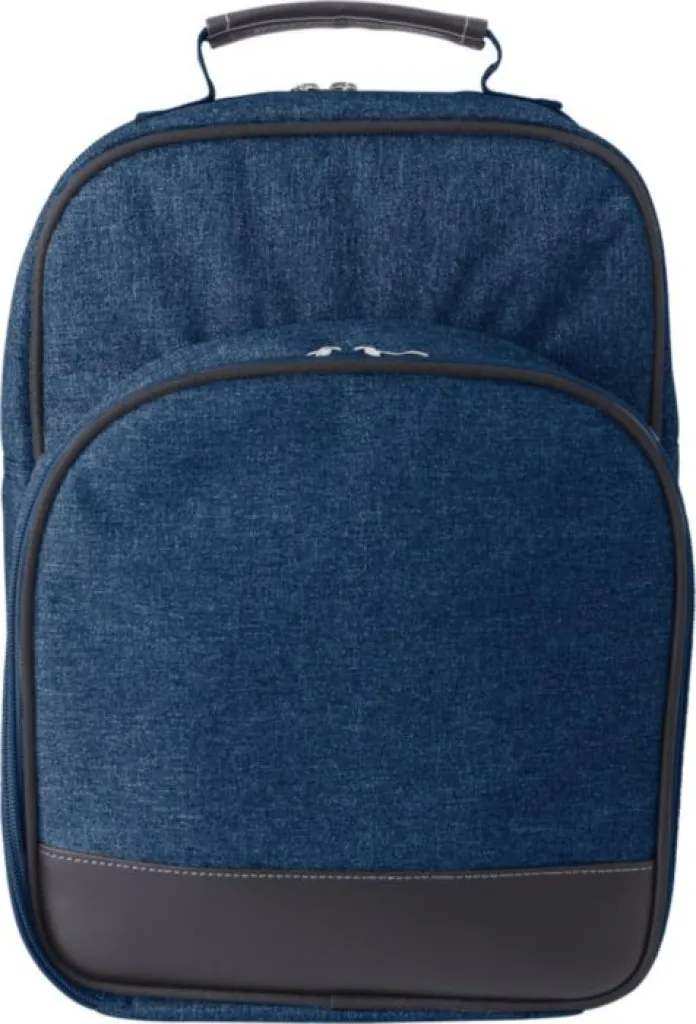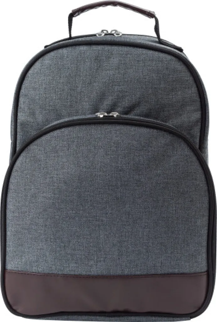 Polycanvas (600D) picnic cooler backpack with aluminium foil lining. One main compartment and one front pocket with cutlery, cups, and plates for two people. Adjustable shoulder straps.