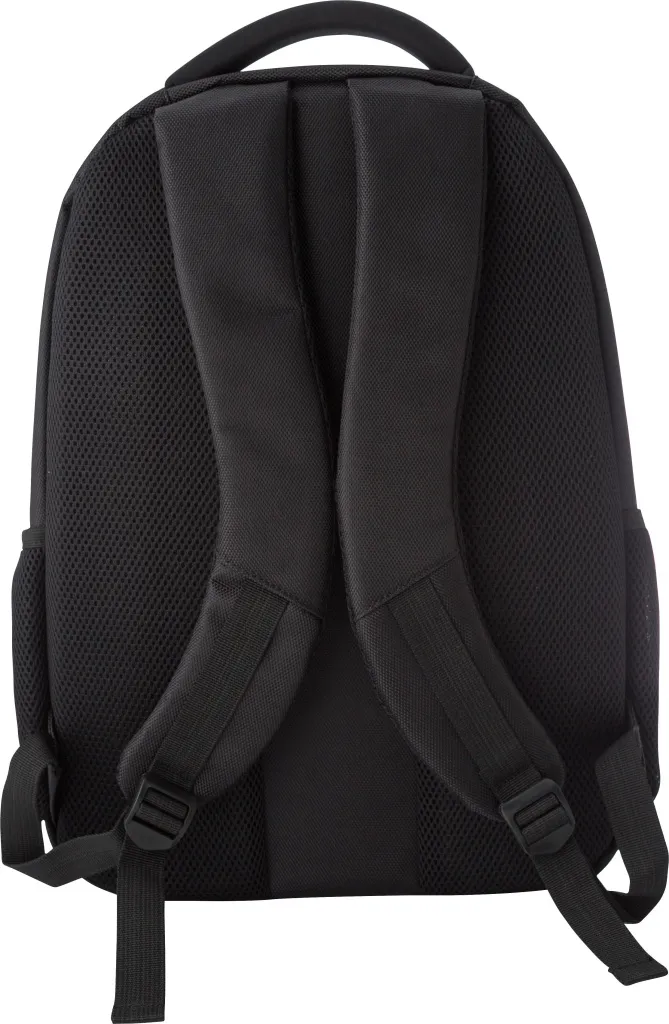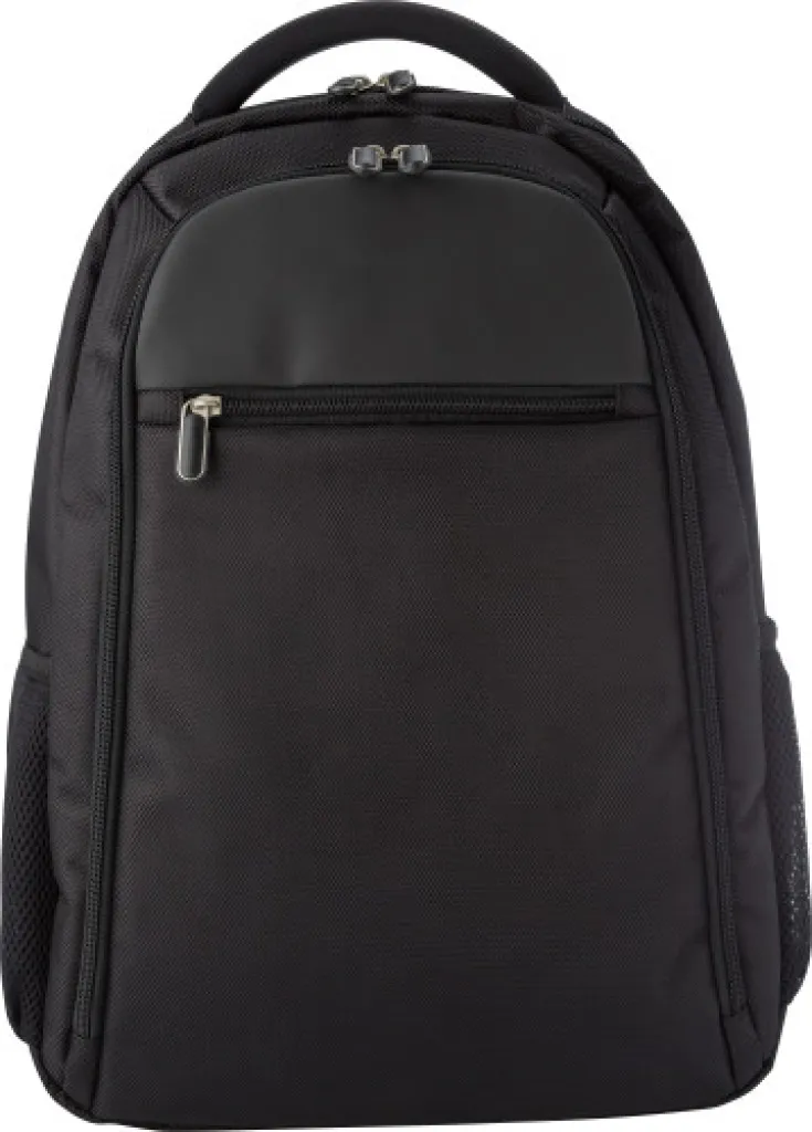 Polyester (1680D) laptop backpack with padded laptop compartment (15 inch) with padded and zippered front pocket.