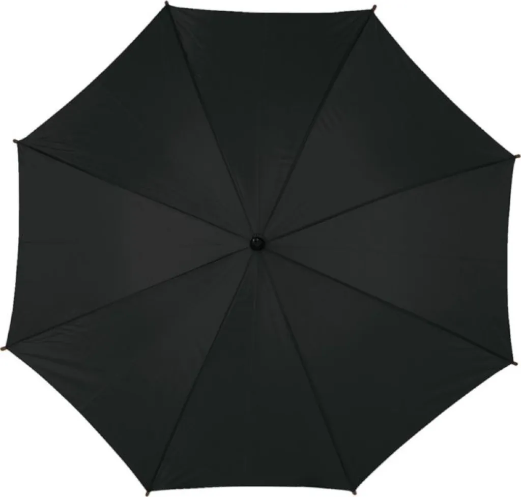 Polyester (190T) automatic umbrella with eight panels. Metal frame and wooden shaft and handle.