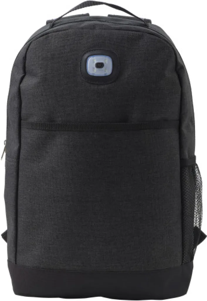 Polyester (300D + 210D) backpack with adjustable and padded shoulder straps and back. Large main compartment, front pocket and mesh side pocket. The backpack has a COB light with two color settings: white and blinking red. Batteries included.