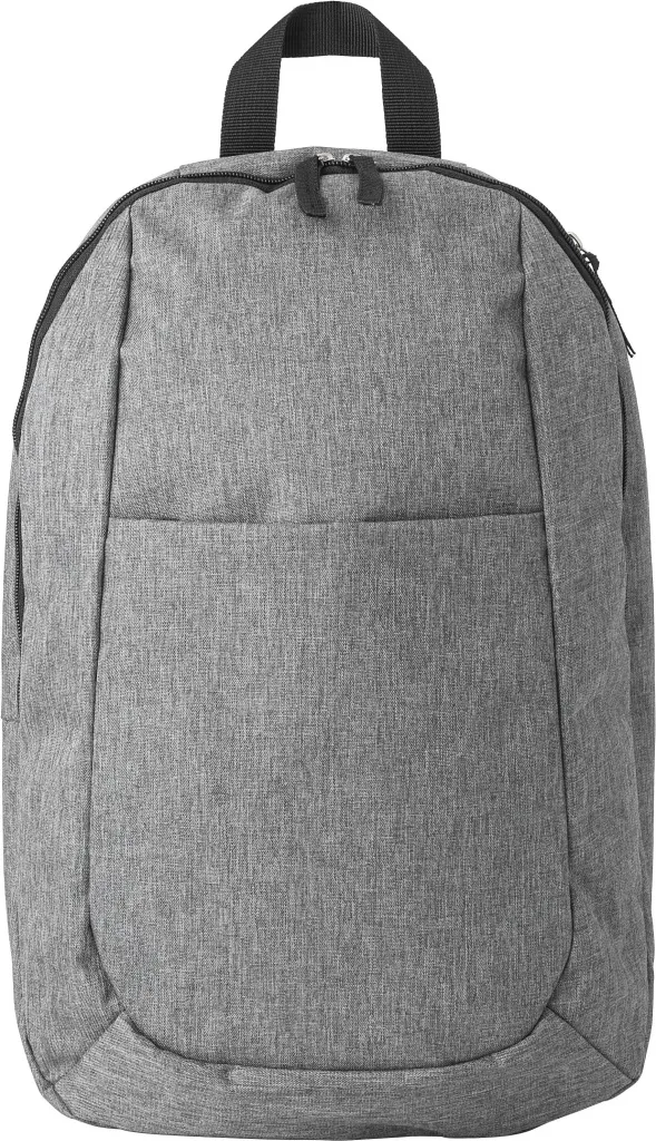 Polyester (300D) backpack, with main compartment, front pocket, and interior pocket. The shoulder straps are adjustable.