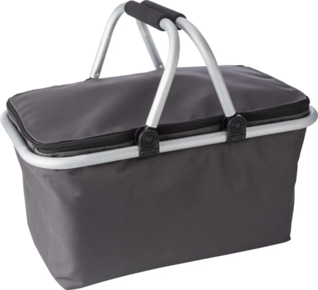 Polyester (320-330 gr/m²) collapsible, cooler shopping basket, lined with foil on the inside. Aluminium frame and handles with EVA foam grip; can be closed at the top with a zipper.
