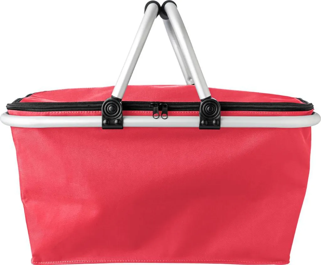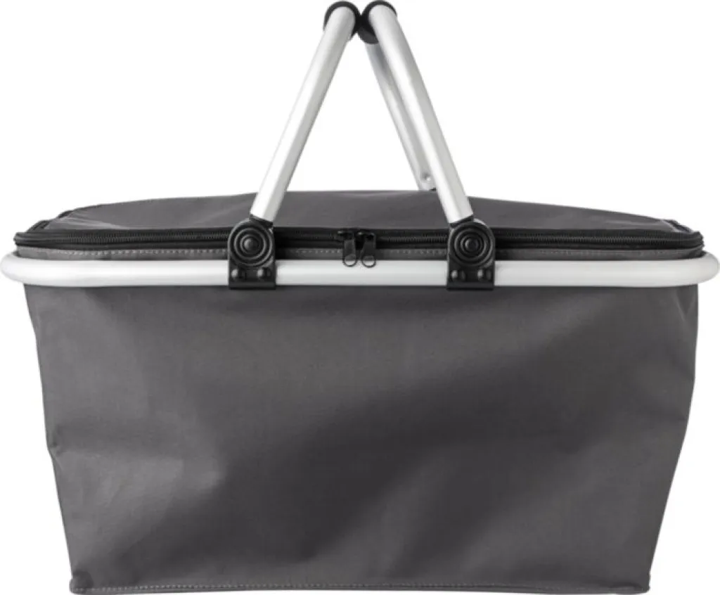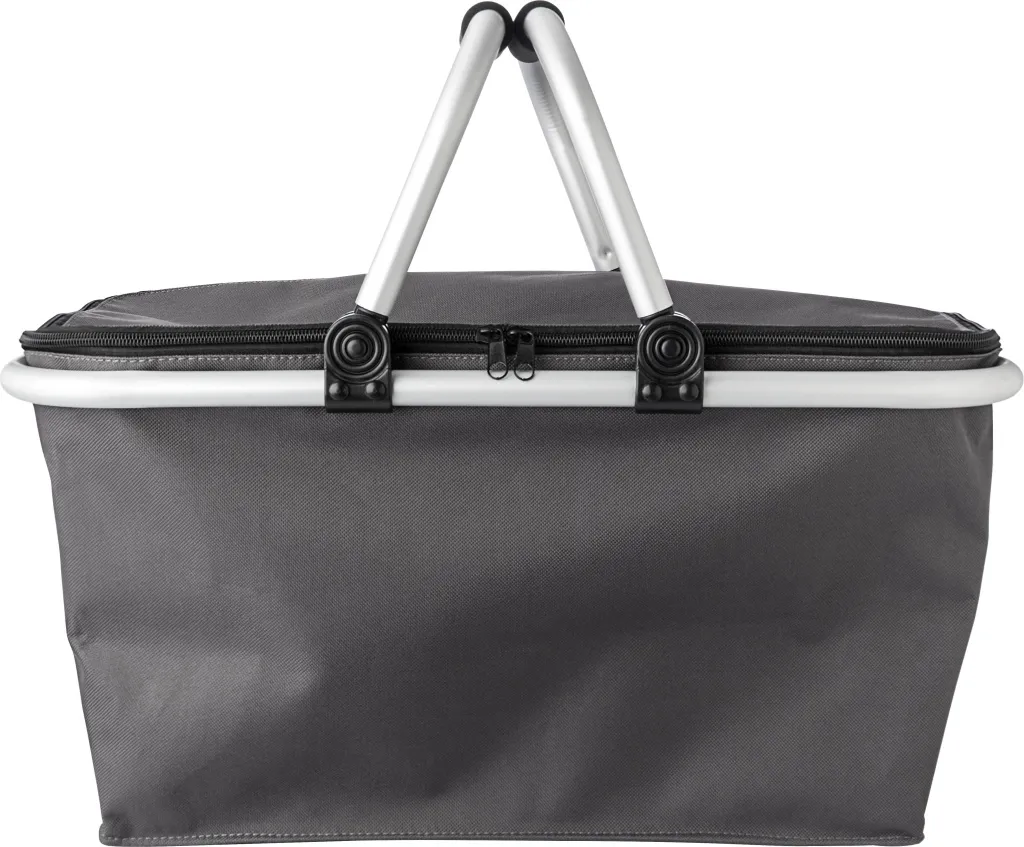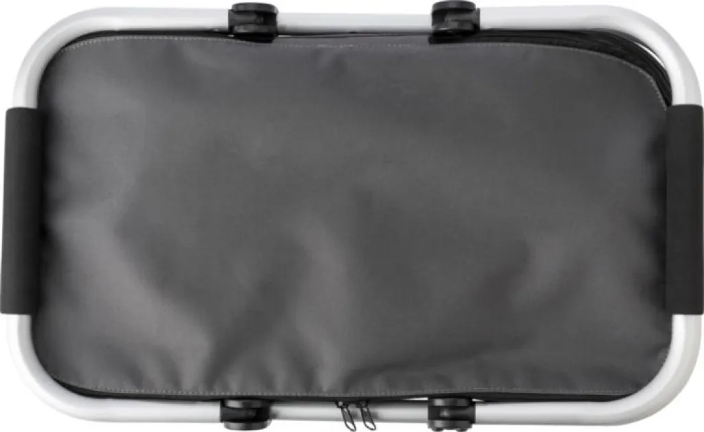 Polyester (320-330 gr/m²) collapsible shopping basket, with an aluminium frame and handles with EVA foam grip; can be closed at the top with a zipper.