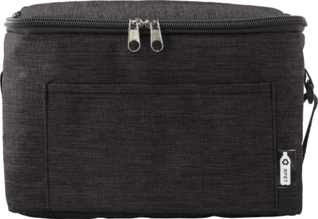 Polyester (600D) and rPET cooler bag with PEVA interior, for six 330 ml cans. With zipper, front pocket, and adjustable strap. Capacity: 3 liters.