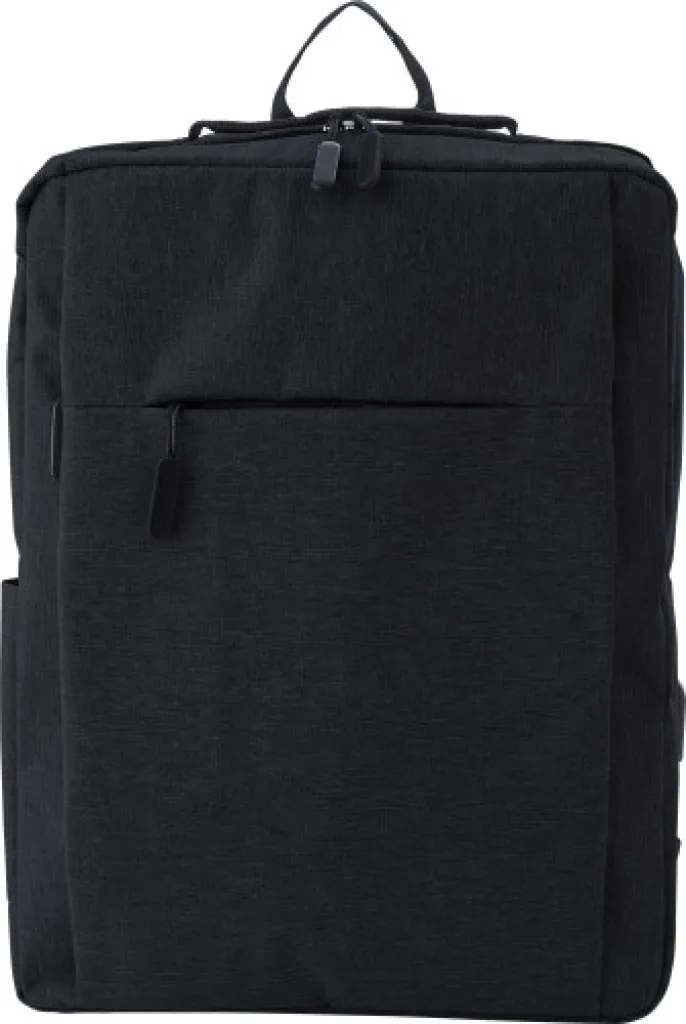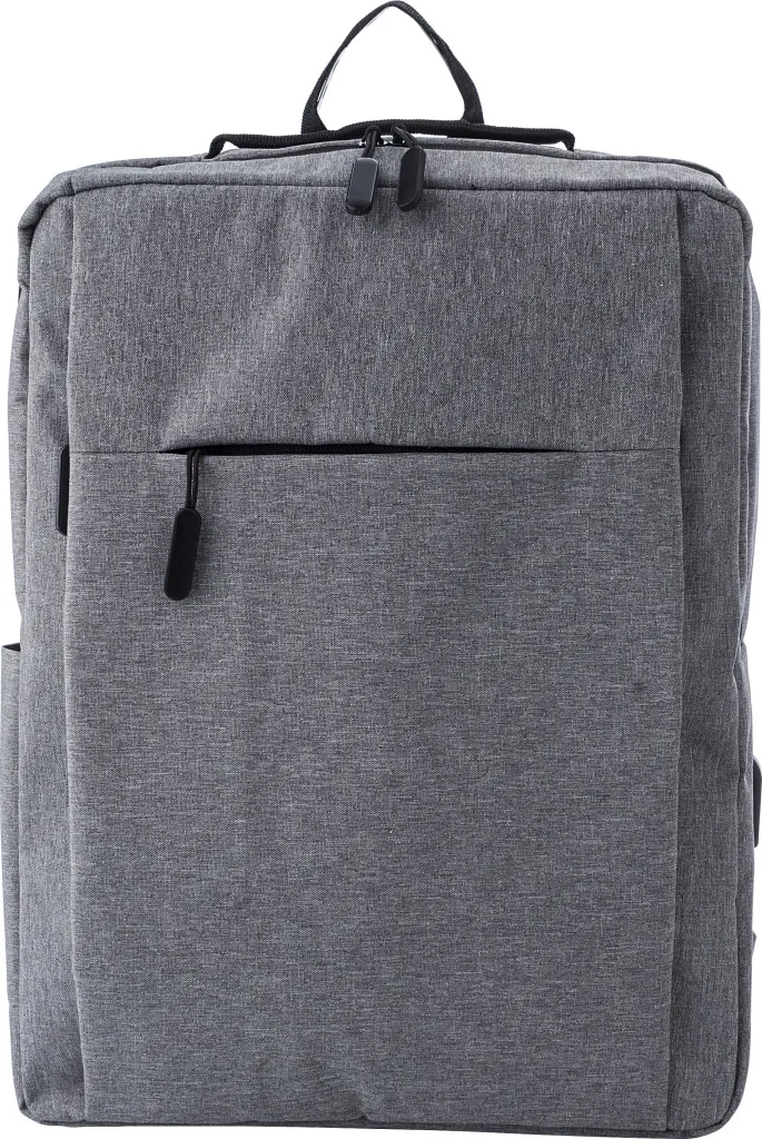 Polyester (600D) backpack with zipper main compartment and front pocket. With USB exit on the side. Adjustable padded shoulder straps.
