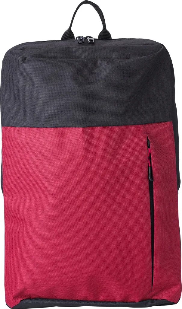 Polyester (600D) backpack with zippered front pocket. Adjustable and padded shoulder straps.