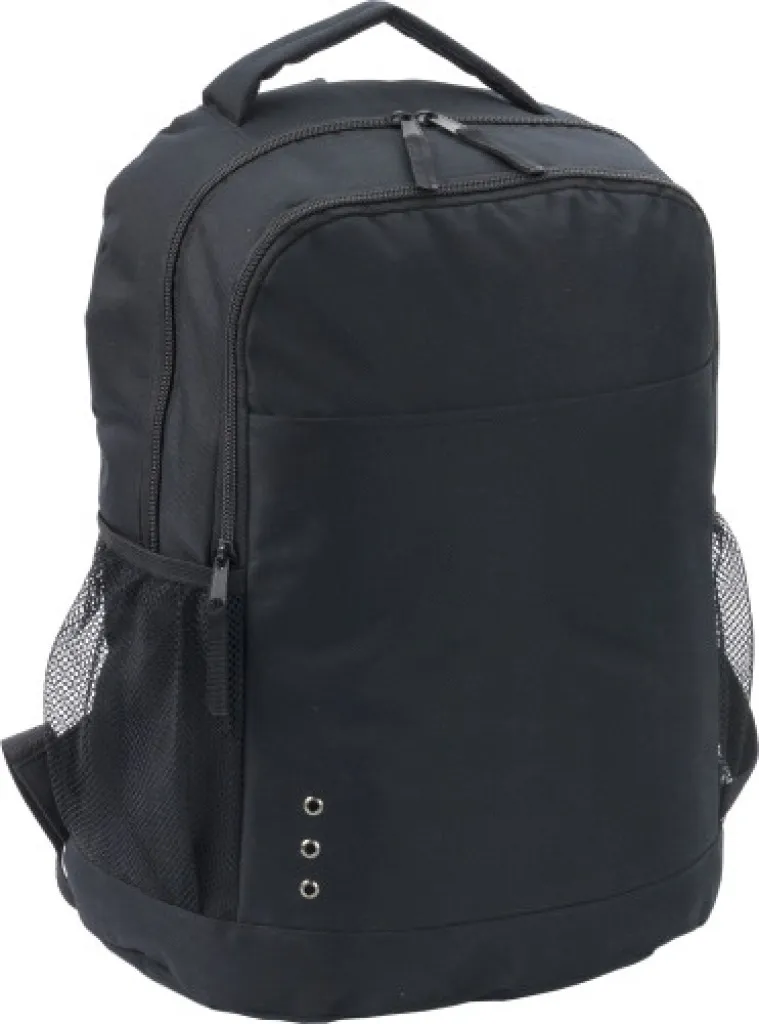 Polyester (600D) backpack with zippered front pocket, two mesh side pockets, and adjustable shoulder straps.