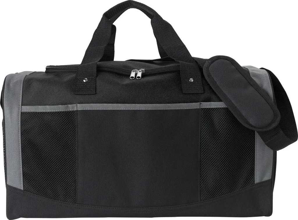 Polyester (600D) duffle bag with short handles and adjustable shoulder strap. One large compartment with zipper, one mesh pocket on the side, 3 front pockets. Reinforced bottom.