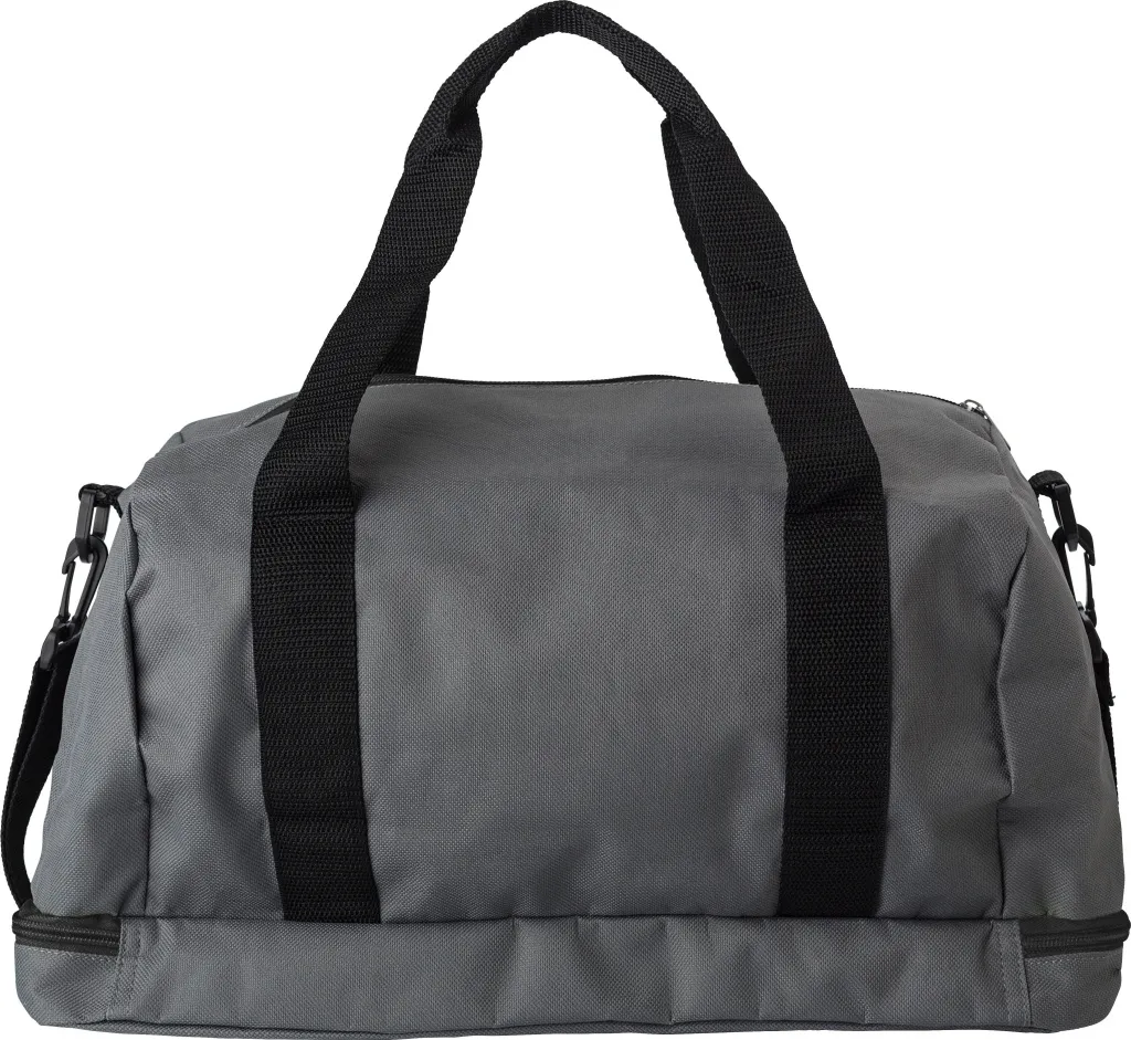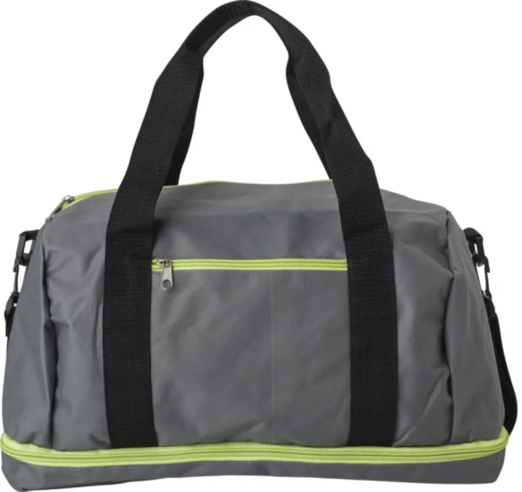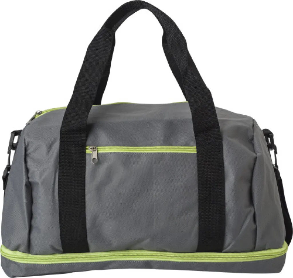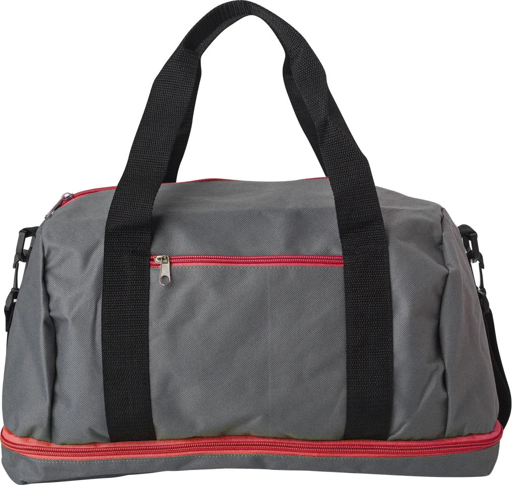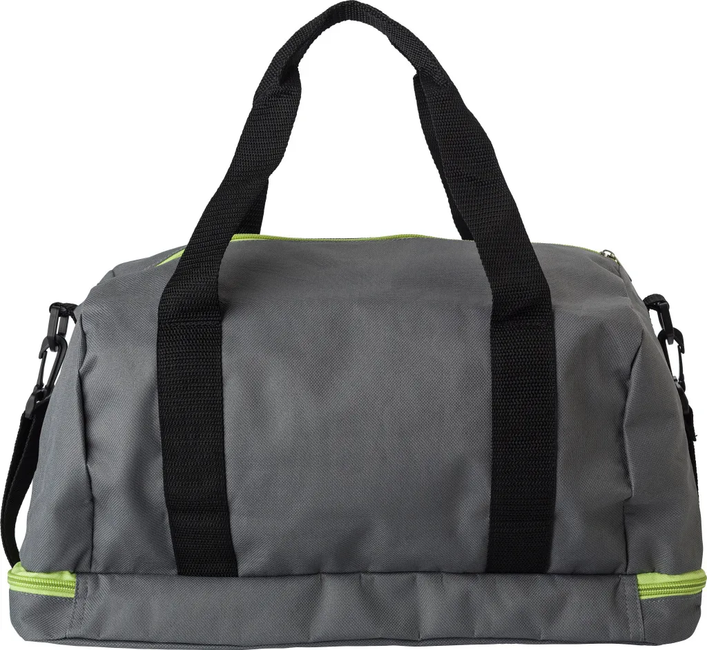 Small polyester (600D) sports bag with one zippered pocket and a separate shoe compartment at the bottom. The bag has two handles and an adjustable shoulder strap.