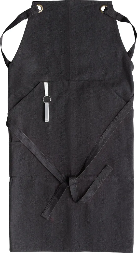 Polyester and cotton apron with colored bands and front pocket. Includes a bottle opener.