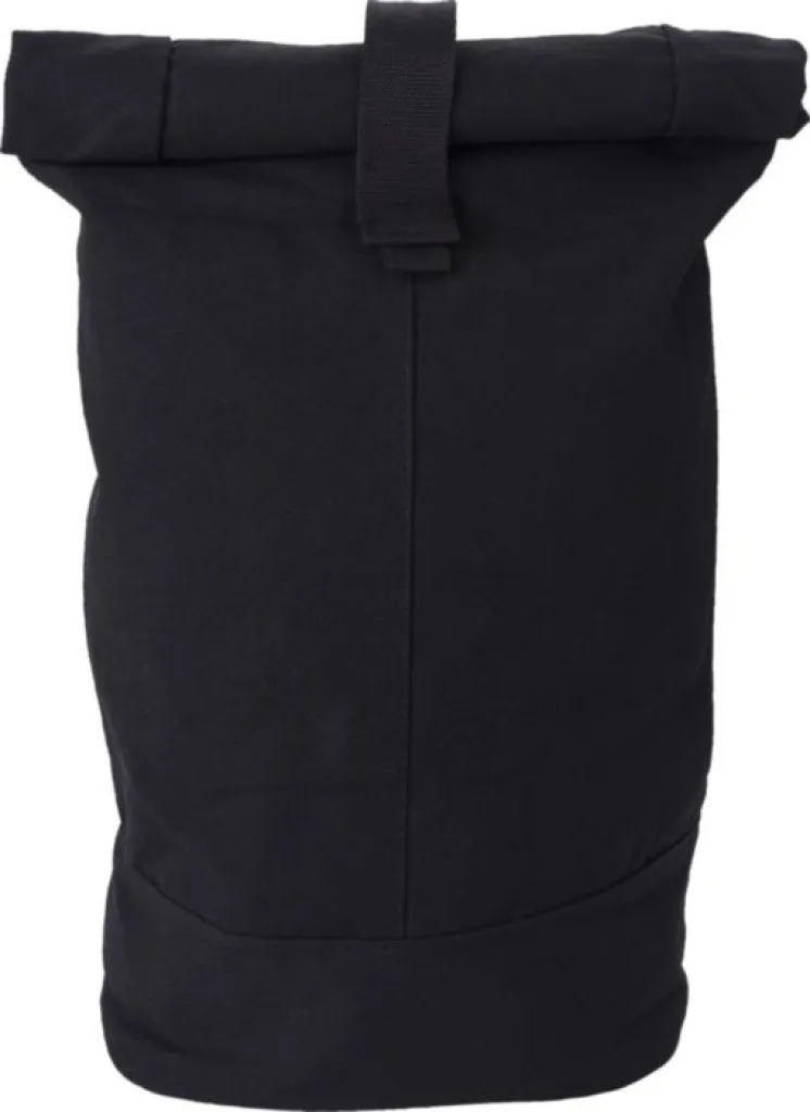 Polyester roll-top backpack with Velcro closing. 340 grams canvas with 210D rPET lining, and mesh backing. Bottom is rPET PU.
