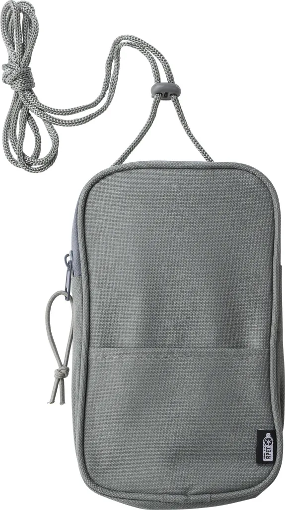 Polyester rPET (600D) cross shoulder bag with adjustable wrist cord. One large compartment with zipper with elastic band and insert pocket. The zipper has an elastic band. With rPET label.
