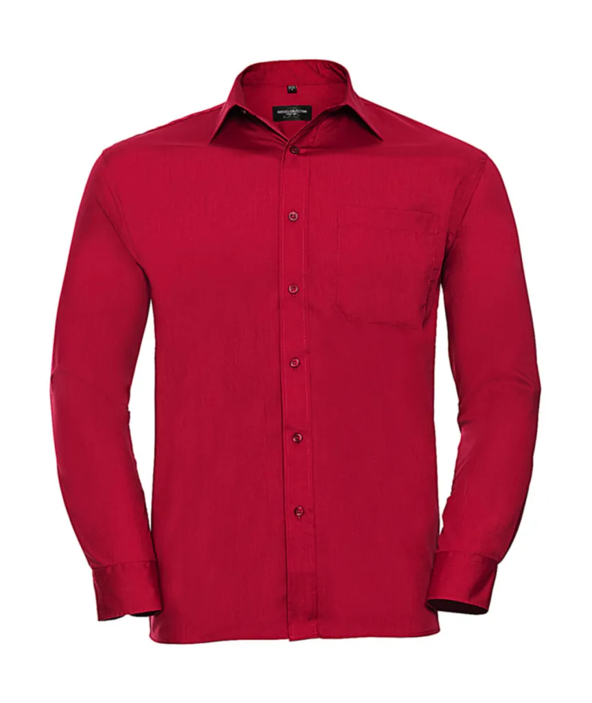 ·110 g/m² (White: 100 g/m²) ·65% Polyester, 35% Cotton (poplin) ·Long sleeves ·Classic style boned collar ·Tonal buttons ·Back yoke with 2 side pleats ·Mitred edge pocket over left chest ·Rounded 2 button adjustable cuff plus single button on cuff gauntlet ·Classic cut ·Straight bottom hem ·Spare button ·Easy Care.