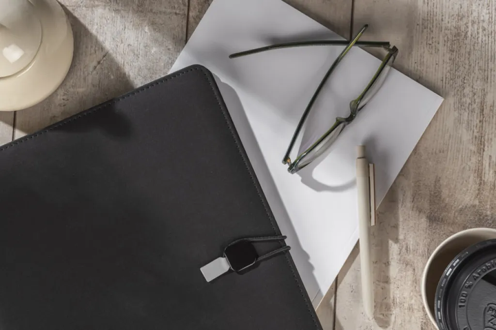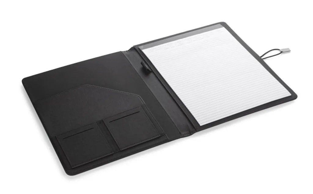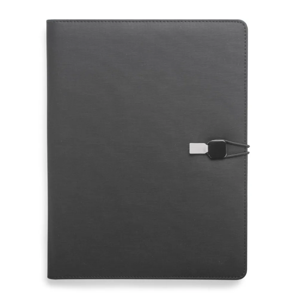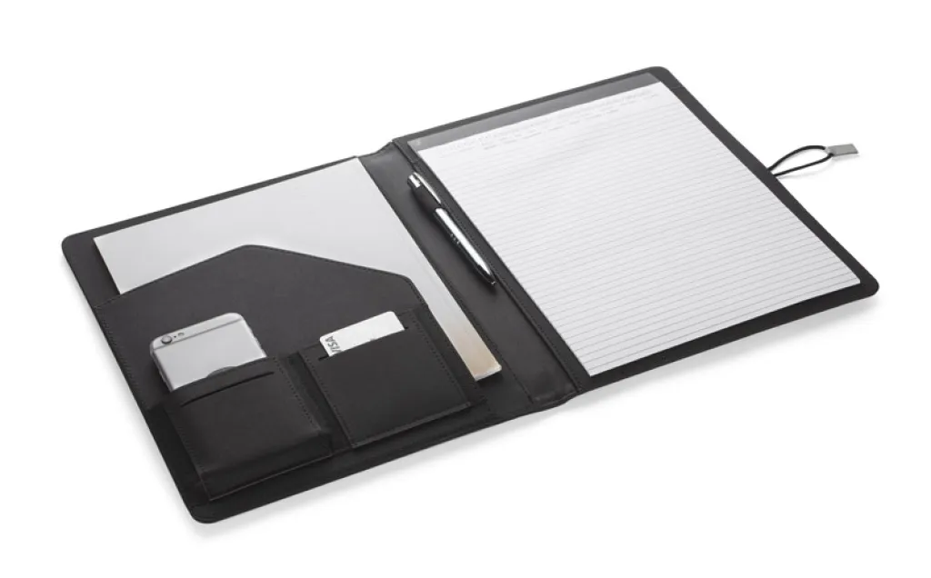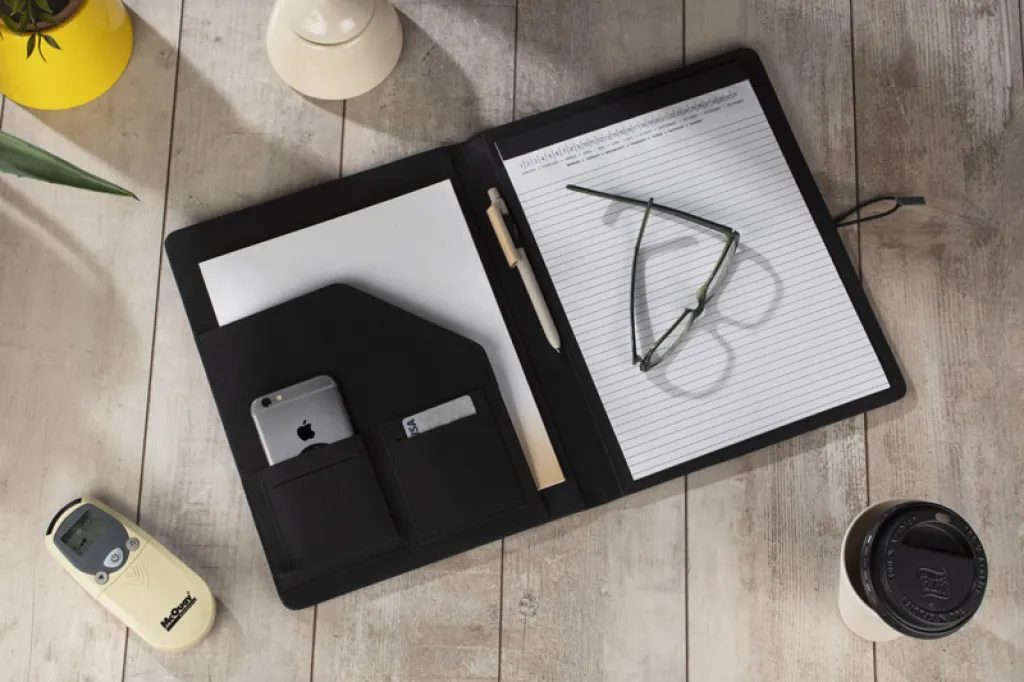 Conference portfolio TELLA closed with a rubber band which end with gray eco-leather. This makes it easier to open the portfolio and at the same time is an interesting and elegant decoration. It includes one pocket for storing documents, two smaller pockets, a place for a pen and business cards and an replaceable A4 notebook.