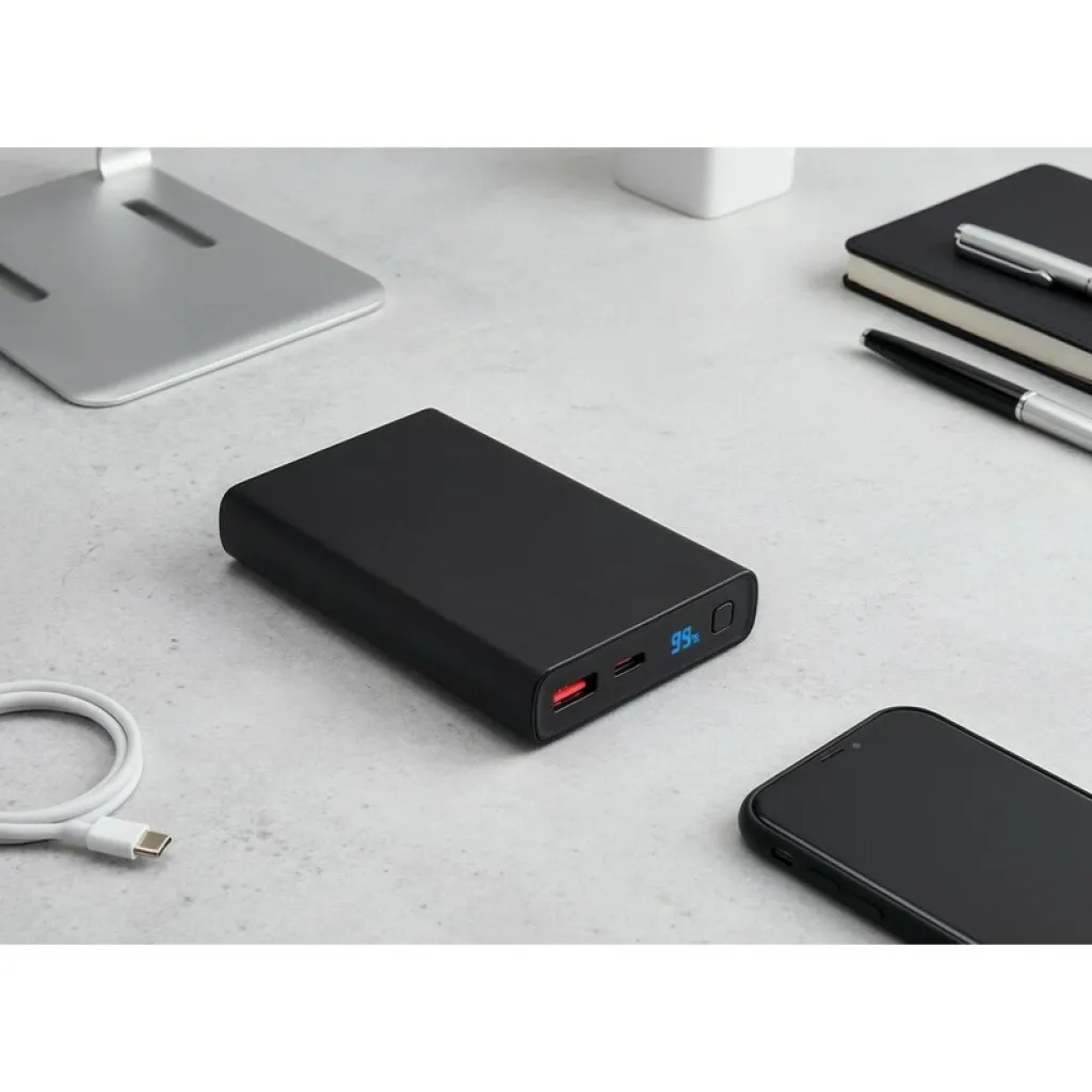 Power bank 10000 mAh with a digital display of power level, USB-C input (5V/2.4A, 9V/2A, 12V/1.5A), USB-C output (5V/3A, 9V2.2A, 12V/1.66A), USB output (5V/3A, 9V/2A, 12V/1.5A), USB-C cable included, product made from ABS