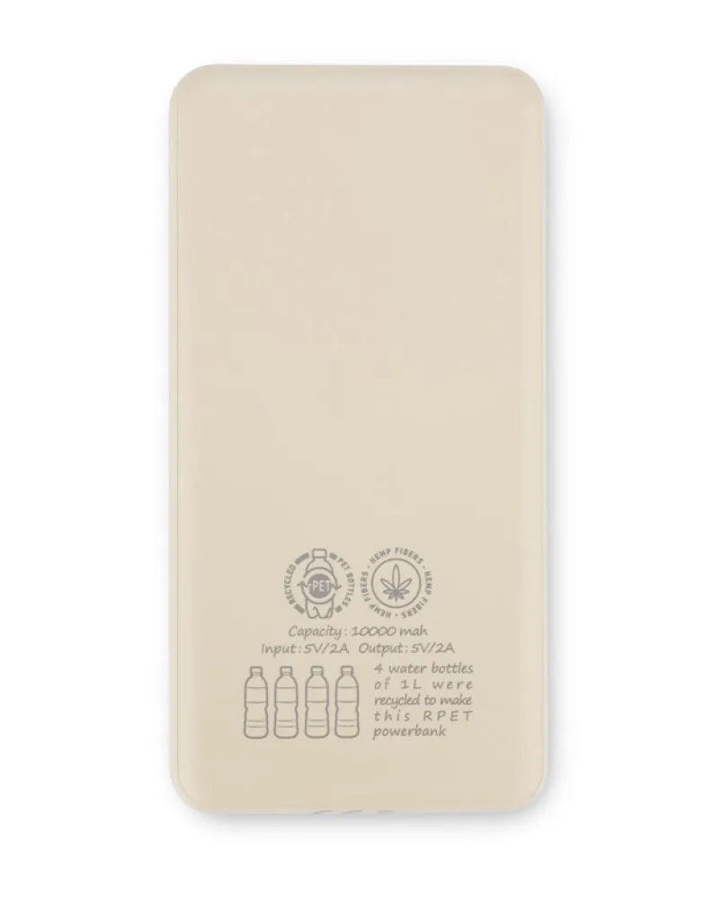 The rPET REPPO power bank with a capacity of 10000 mAh is made of material recycled from four 1-litre bottles and hemp fibres. The product has the ability to charge via 4 ports: 2 x USB-A, 1 x USB-C, 1 x microUSB. Specifications: - input: 5V/2A, - output: 5V/2A. Four-stage charge indicator. Product complies with the relevant European Union directives, CE mark and 1 year warranty. MicroUSB charging cable included. Packaged in a recycled cardboard box with printing using soya-based ink.