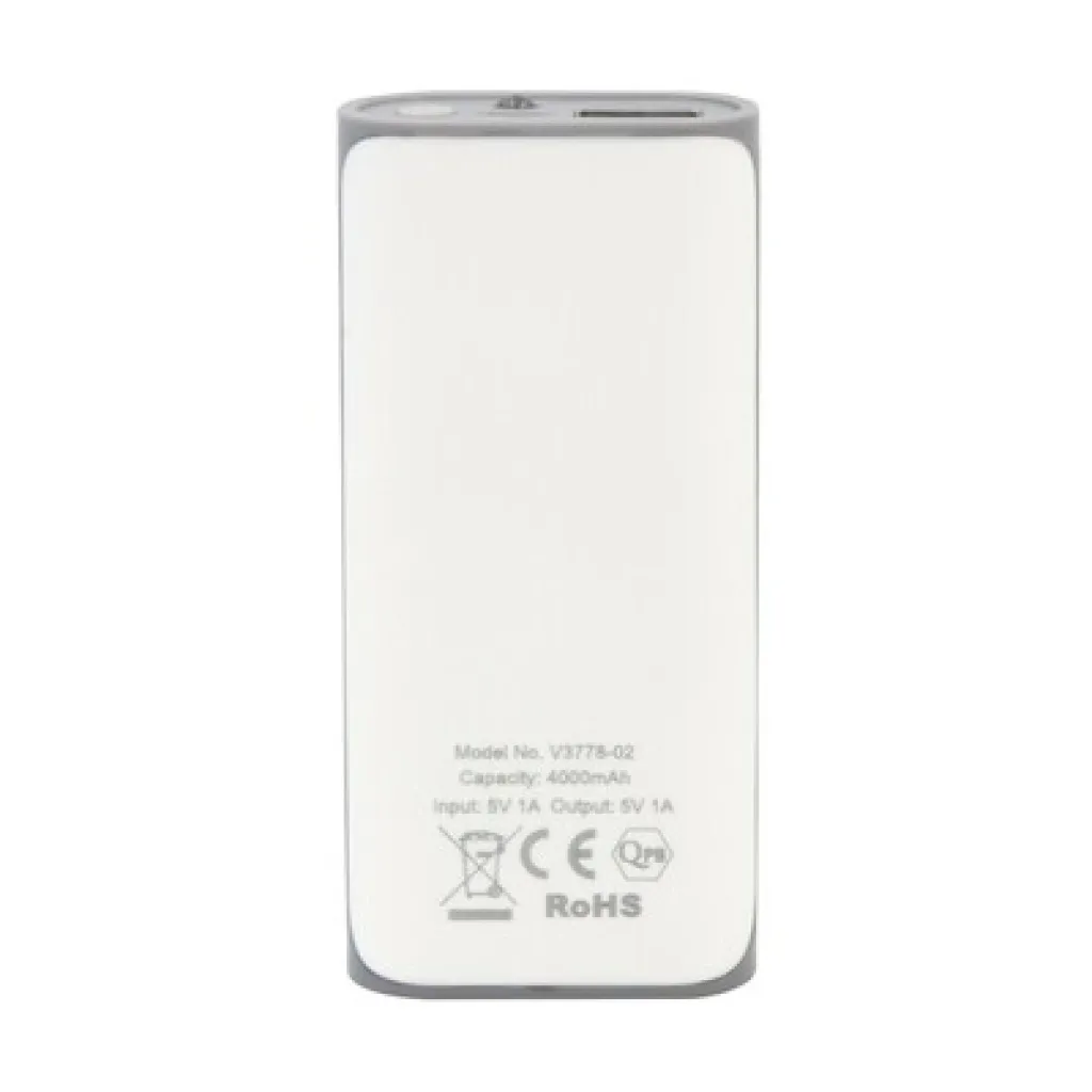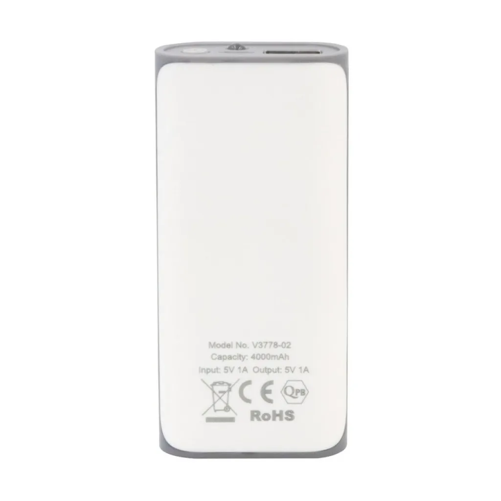 Power bank 4000 mAh, output 5V/1A, input 5V/1A, 4 diodes indicating power level, LED light, micro USB cable included