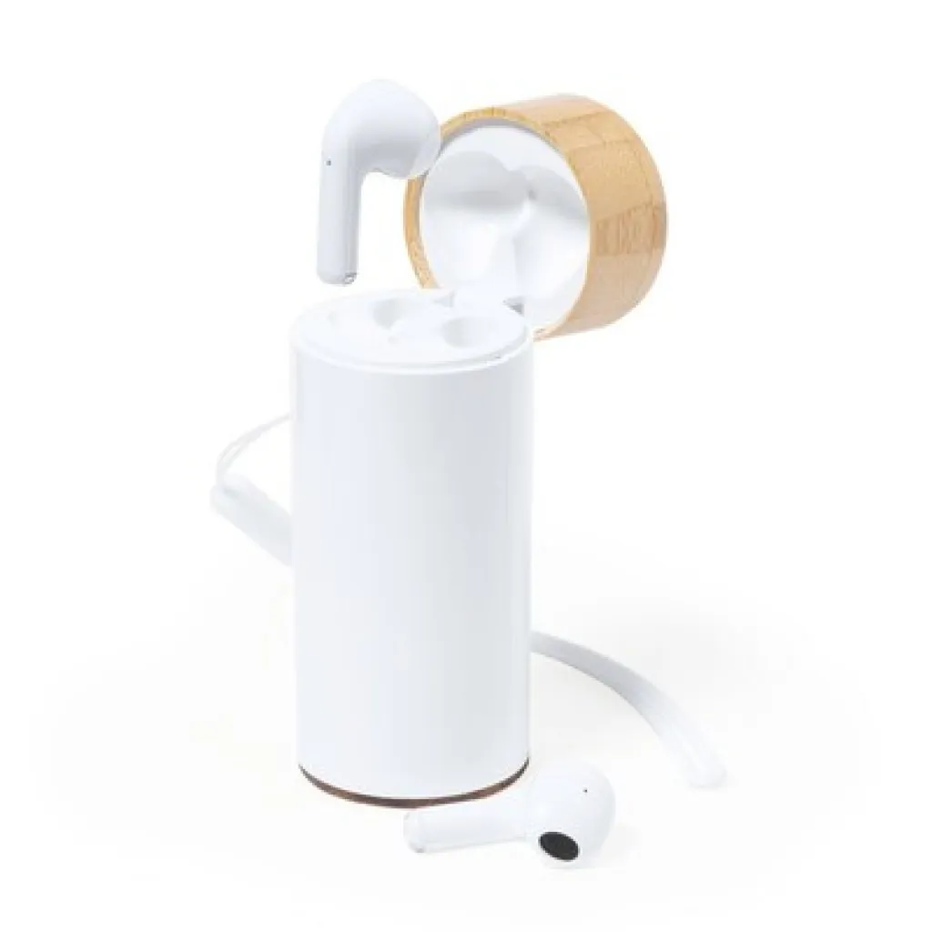 Power bank 4500 mAh, wireless earphones, BT 5.0, 30 mAh earphones battery, bamboo details, can charge two devices simultaneously, USB output, USB type C input/output, integrated cable included