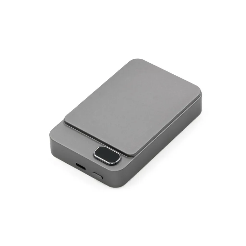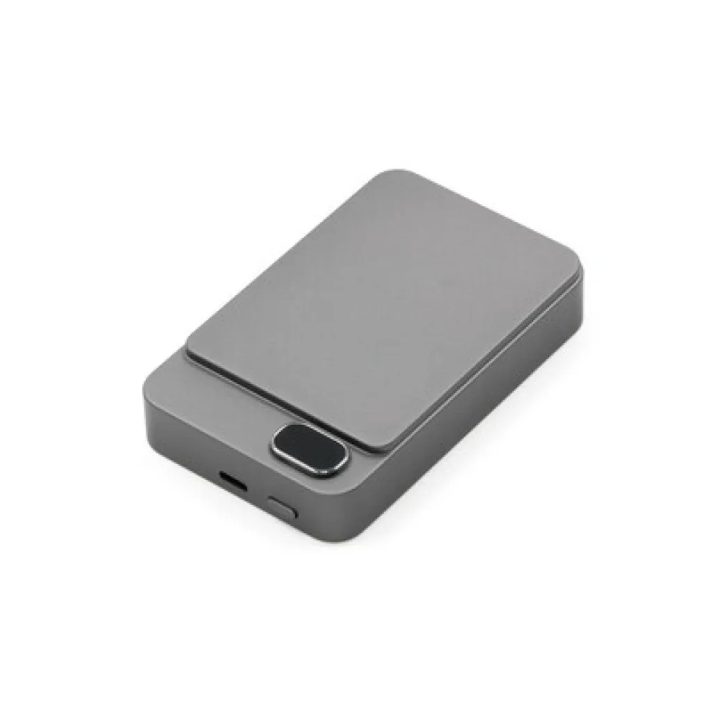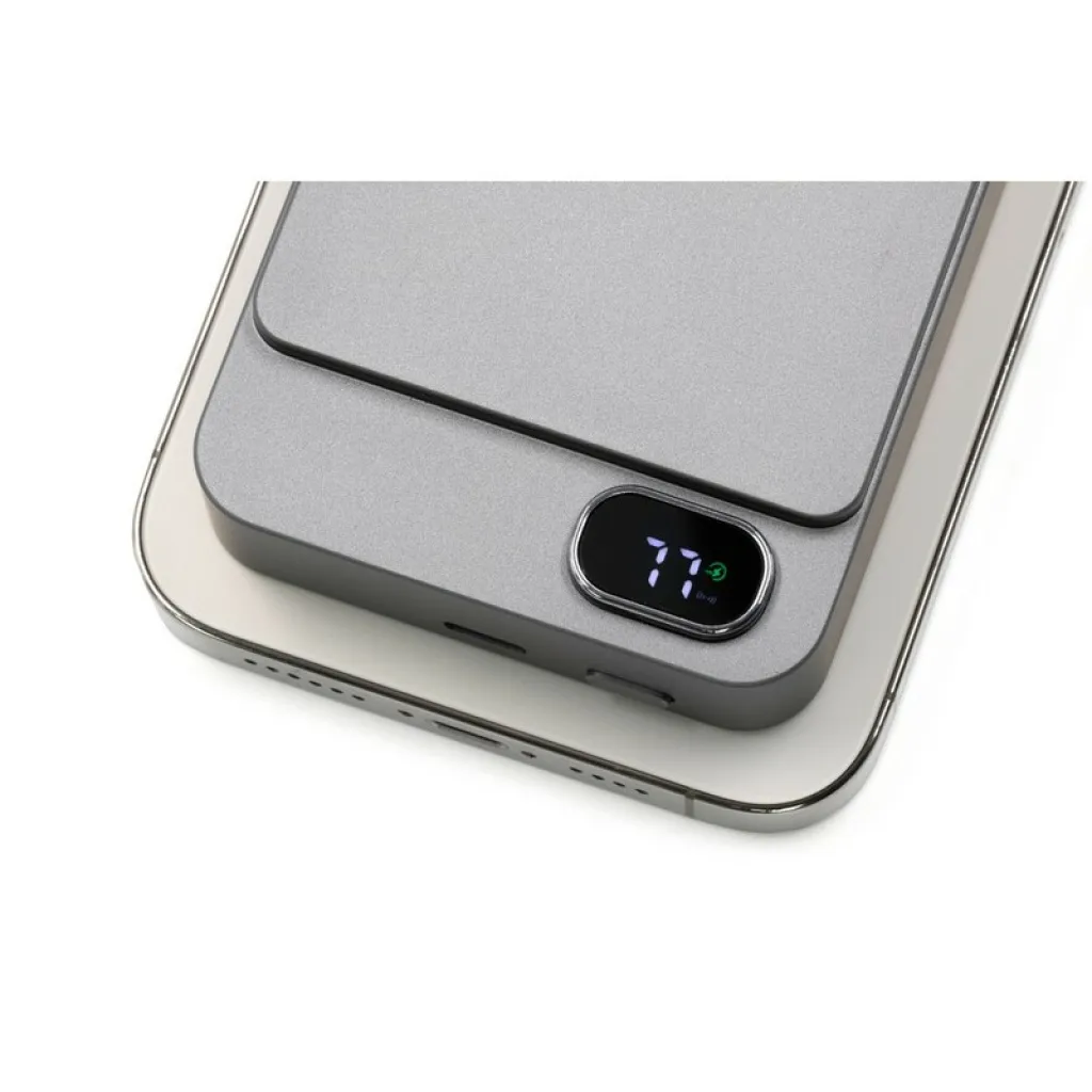 Powerbank BrandCharger Powerwave 10000, sleek aluminium unibody, 10,000 mAh capacity, supports 15W fast wireless charging (MagSafe, Qi1, and Qi2 compatible), a 20W USB-C port with PD 3.0 powers laptops and other devices, the LCD display shows battery status, equipped with a smart chip, it protects devices from overcurrent, overcharging, overheating, and short-circuiting, offering reliable and safe charging, product made from ABS and recycled aluminium