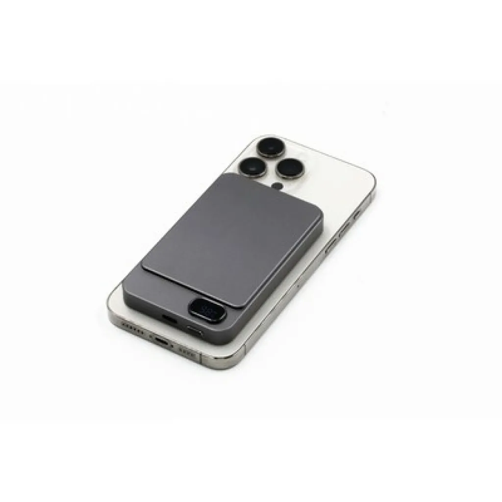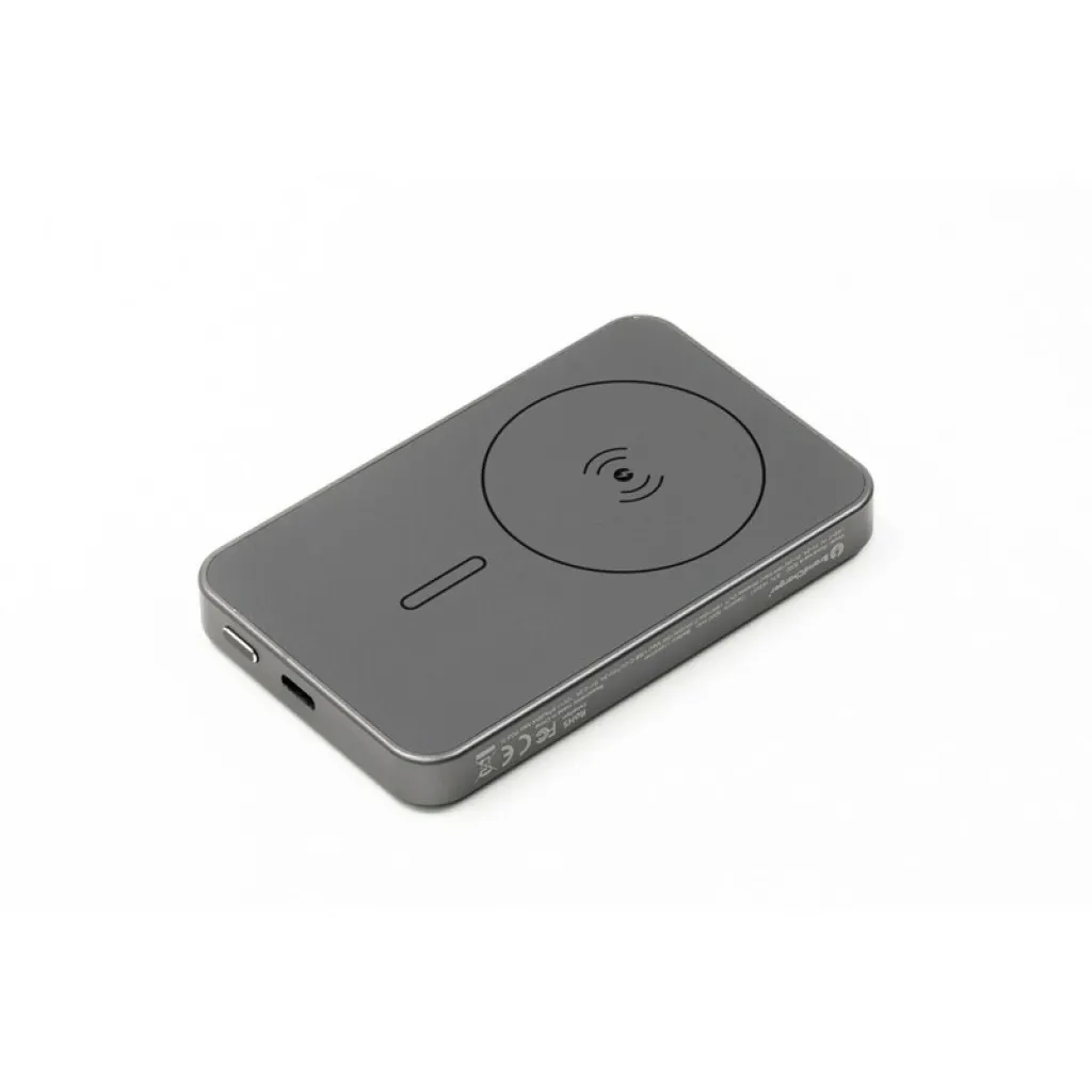 Wireless Powerbank BrandCharger Powerwave 5000, slim aluminium unibody design that fits easily in any pocket, 5,000 mAh capacity, supports 15W magnetic wireless charging (MagSafe, Qi1 & Qi2) for easy, cable-free charging, includes a 20W (PD 3.0) USB-C port to charge laptops or other devices, the LCD display shows battery level and charging status, while a smart chip offers protection from overcurrent, overcharging, overheating, and short-circuiting, magnetic snap for quick, secure attachment, product made from ABS and recycled aluminium.