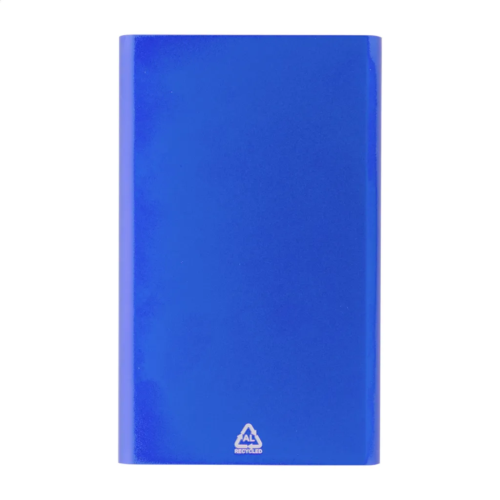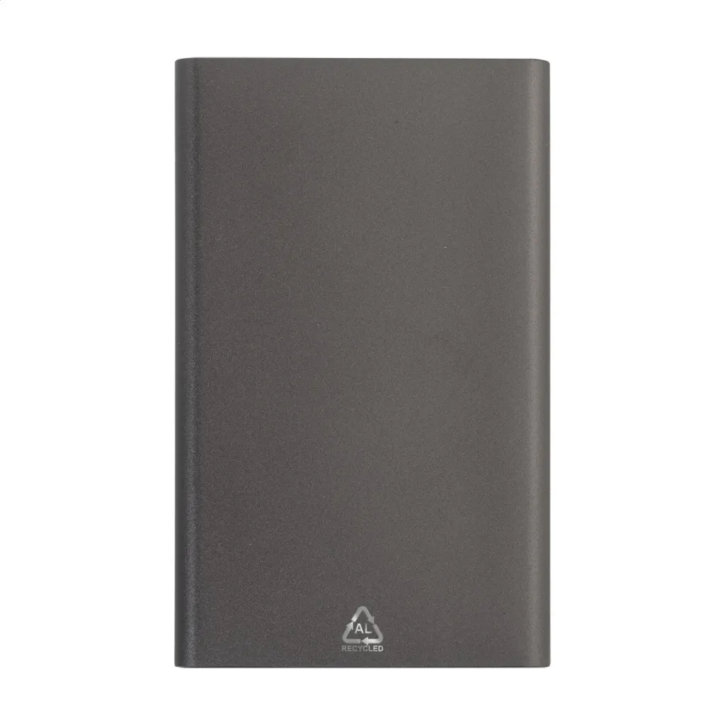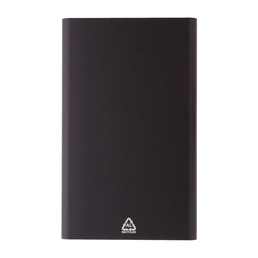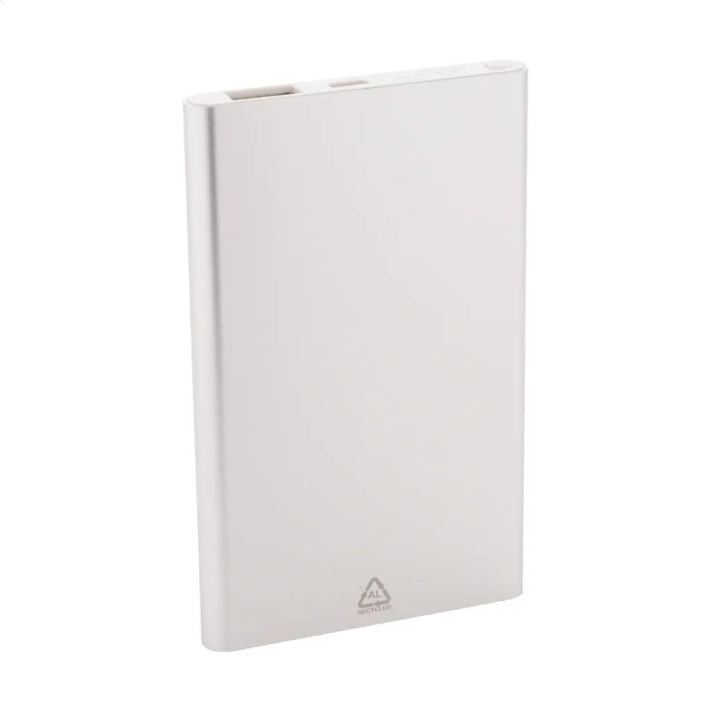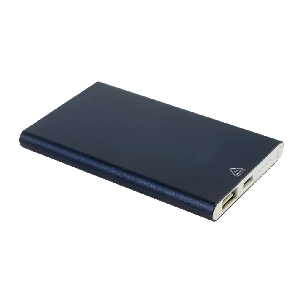 USB power bank in recycled aluminium housing with 4000 mAh battery. With 1 USB and 1 USB-C charger ports. USB-C input port. Including USB charger cable.