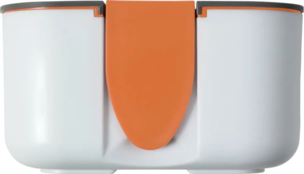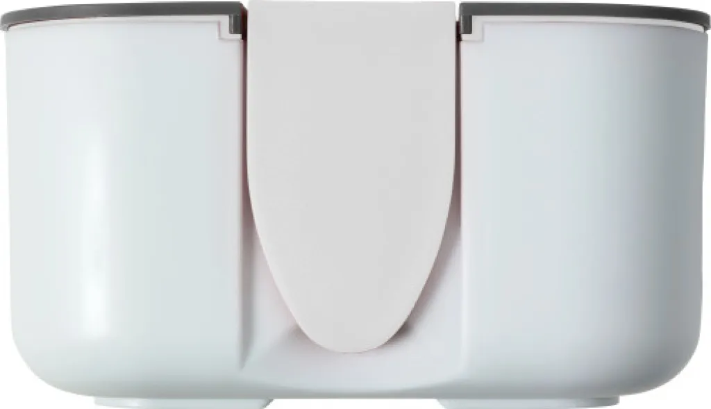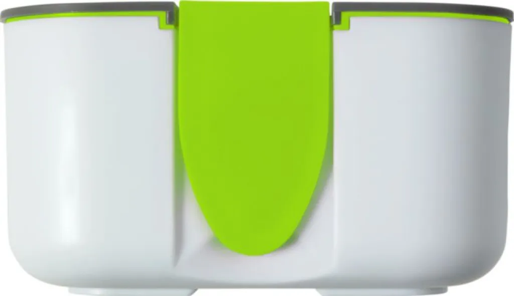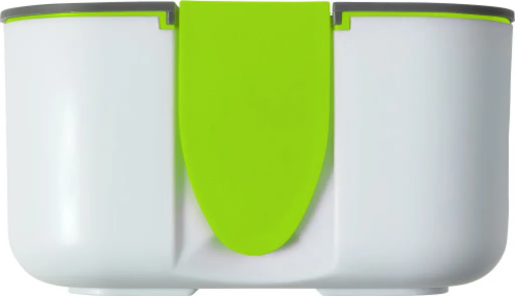 PP and silicone lunchbox with a capacity of 850 ml. The inside includes one separator. The closure on the lid doubles as a phone holder.