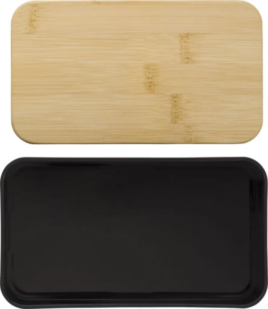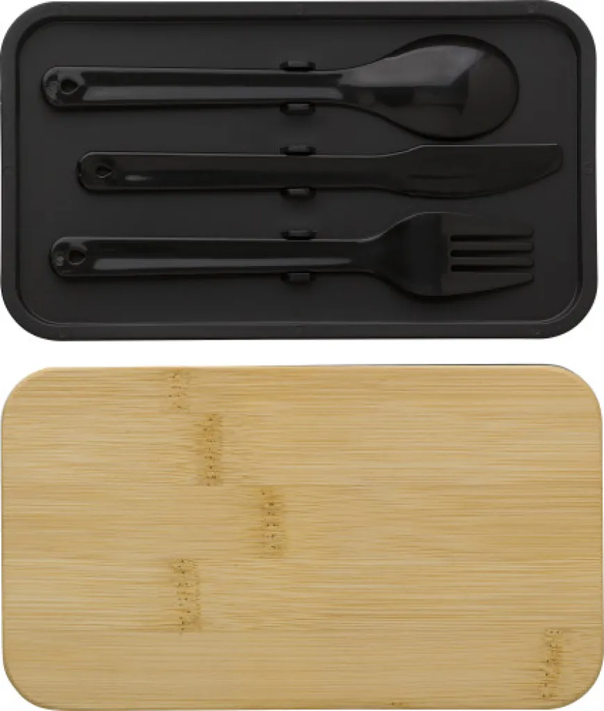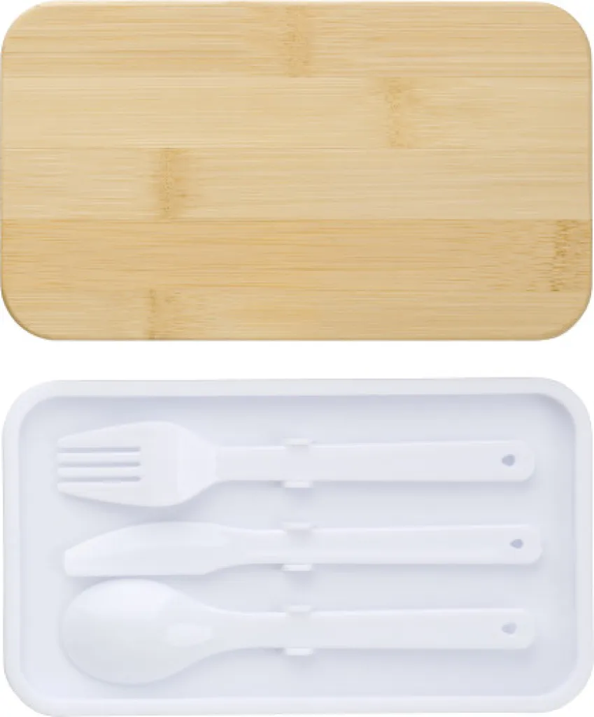 PP double layer lunch box with multiple compartments (2 x 400 ml) and bamboo lid. Including divider and plastic cutlery (spoon, fork, and knife), and elastic band.