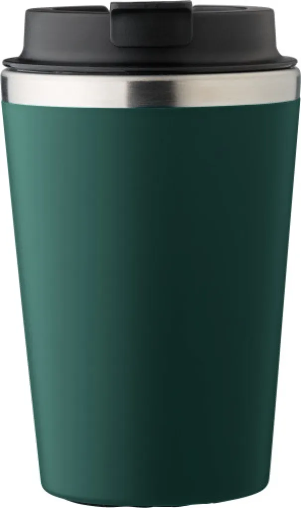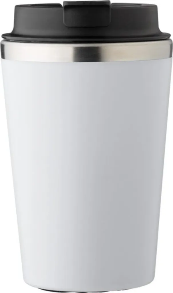 Stainless steel and PP travel mug (350 ml). The PP lid has a silicone closing ring with a foldable closure on top. Individually packaged in a brown cardboard box.