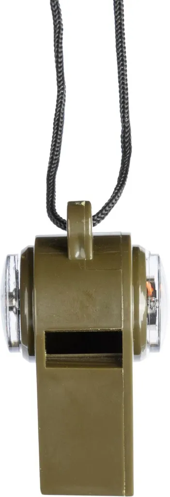 PP whistle (90 dB) with a compass and thermometer on the side. Thermometer displays in Celsius. Includes a 100 cm polyester neck cord with an ABS safety buckle. Individually packaged in a brown cardboard box.