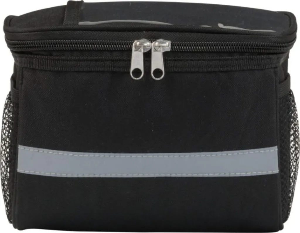 Polyester (600D) bicycle cooler bag with PEVA lining and a PVC pocket on top. Includes a reflective strap, mesh pockets on both sides, and a large cooler to be closed by a zipper.