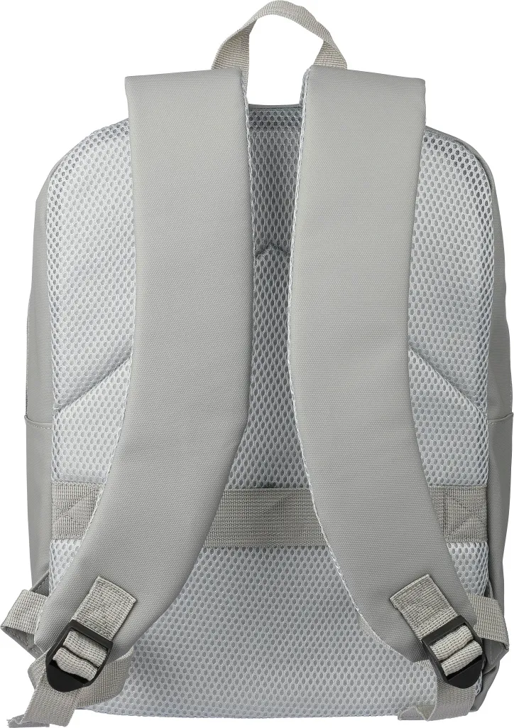 PU laptop backpack (15 inch) with two zippered front pockets, a large zippered compartment with a Velcro-closed laptop section, and multiple inserts inside. Ventilated padded backside with trolley strap and adjustable shoulder straps. Water repellent.