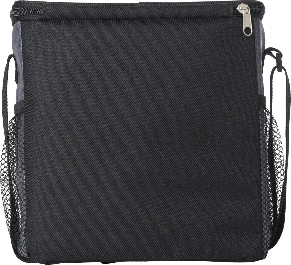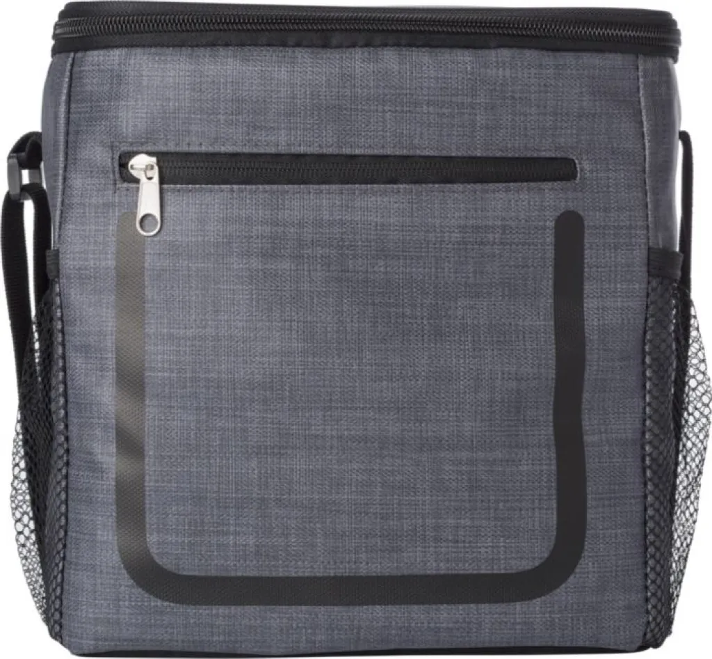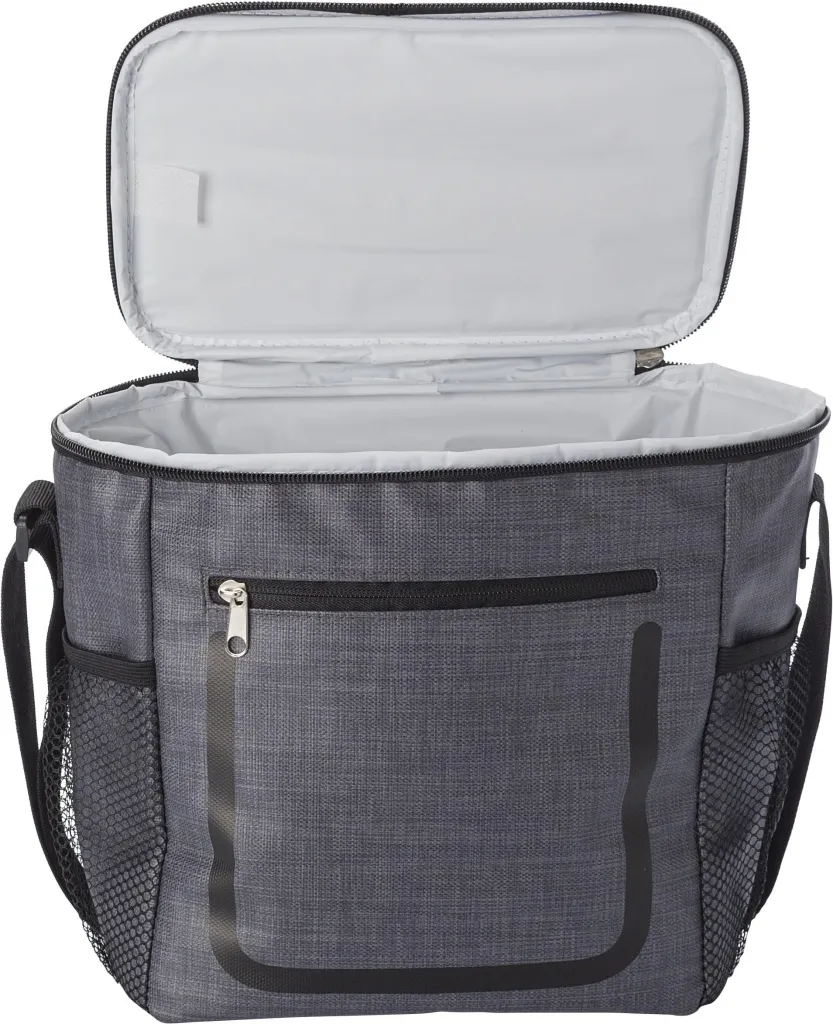 PU cooler bag with front pocket with zipper and netted compartments on either side. The interior is lined with white cooler foil. The bag has an adjustable shoulder strap.