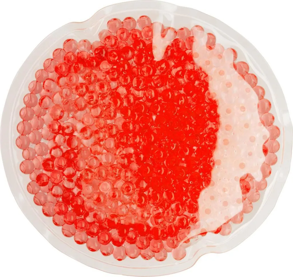 PVC hot/cold pack filled with water beads. Can be reheated or re-cooled after use by putting it in a pan with warm water or the freezer.