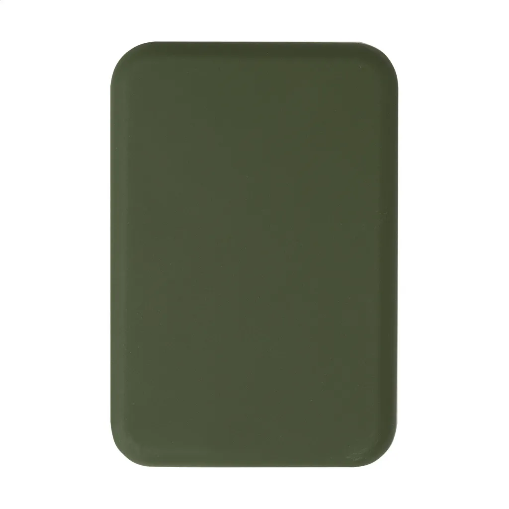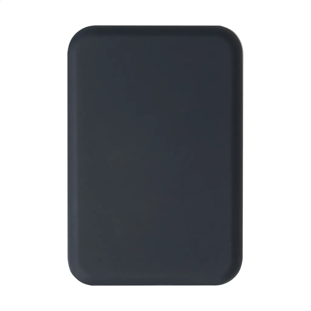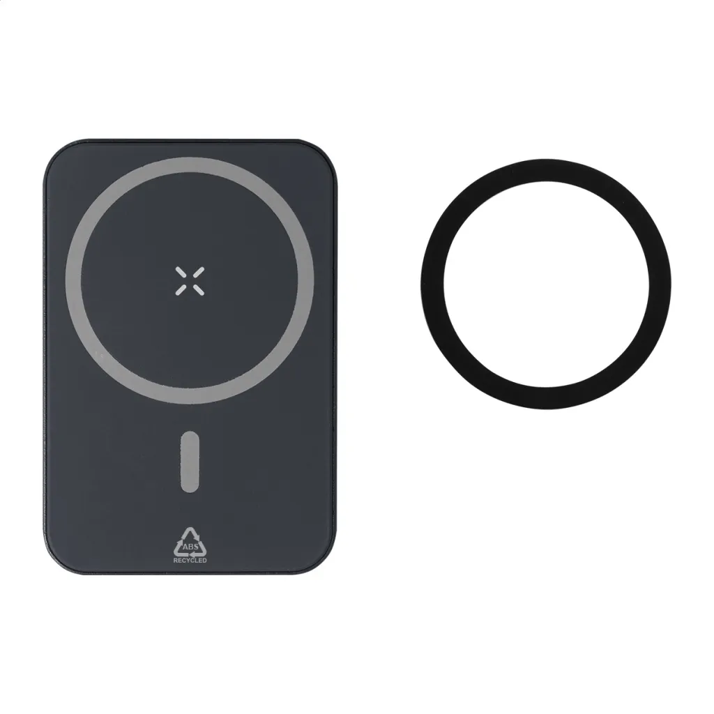 Recycled ABS power bank with 5000 mAh battery and built-in magnetic wireless charger (5W). With USB-C input and charger port. Including self-adhesive metal ring to use the magnetic function on any wirelessly chargeable device. Compatible with iPhone® 12 or newer. Including USB charger cable.