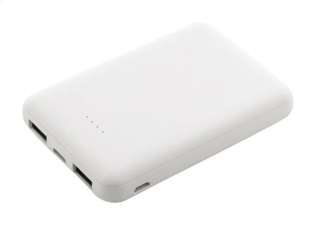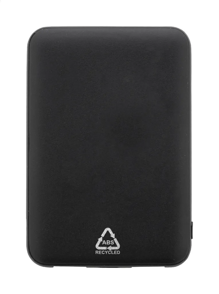 Recycled ABS power bank with 5000 mAh battery. With 2 USB and 1 USB-C charger ports. Micro USB and USB-C input ports. Including USB charger cable.