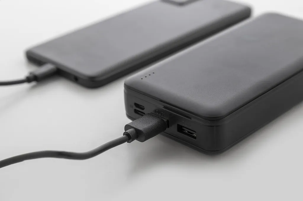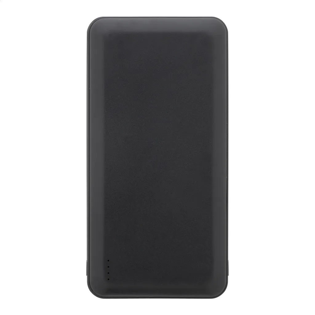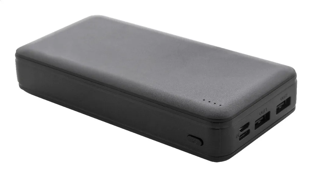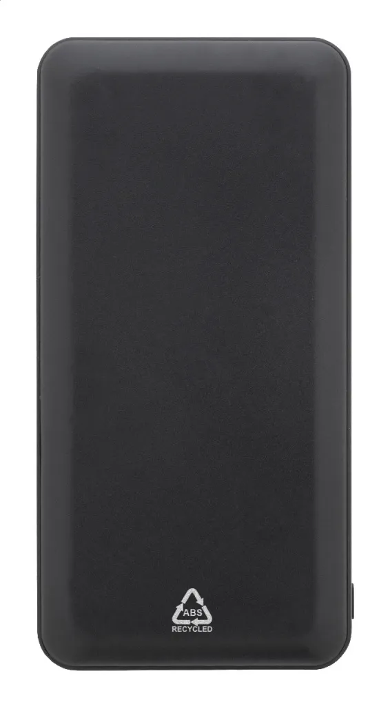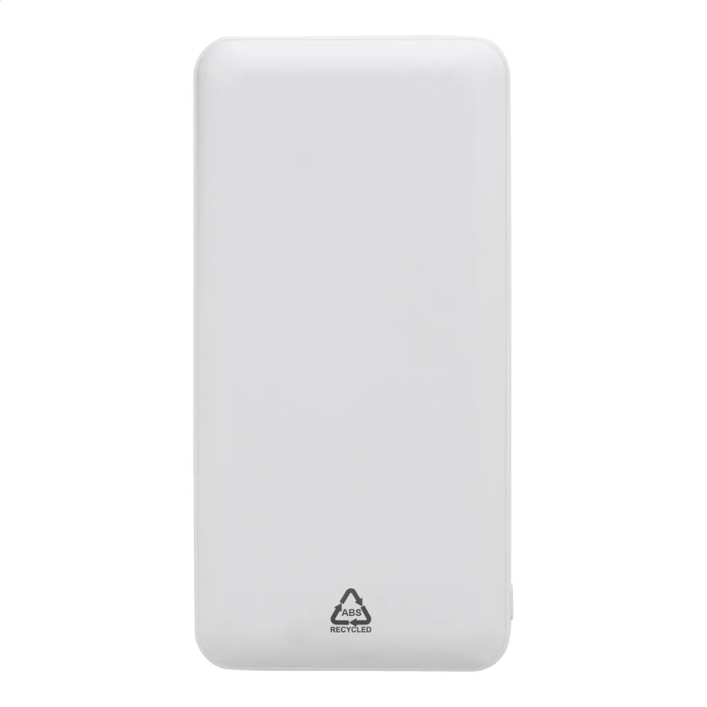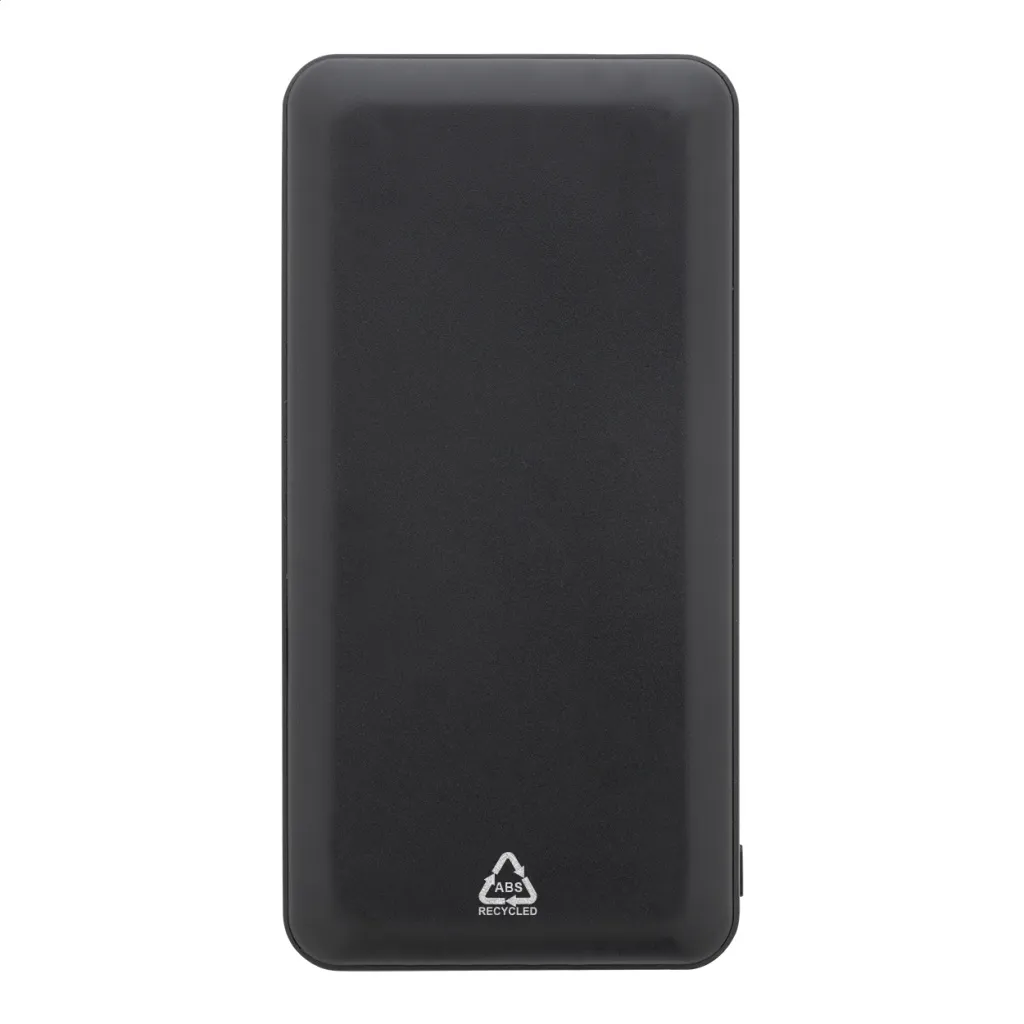 Recycled ABS power bank with 20000 mAh battery. With 2 USB and 1 USB-C charger ports. Micro USB and USB-C input ports. Including USB charger cable.