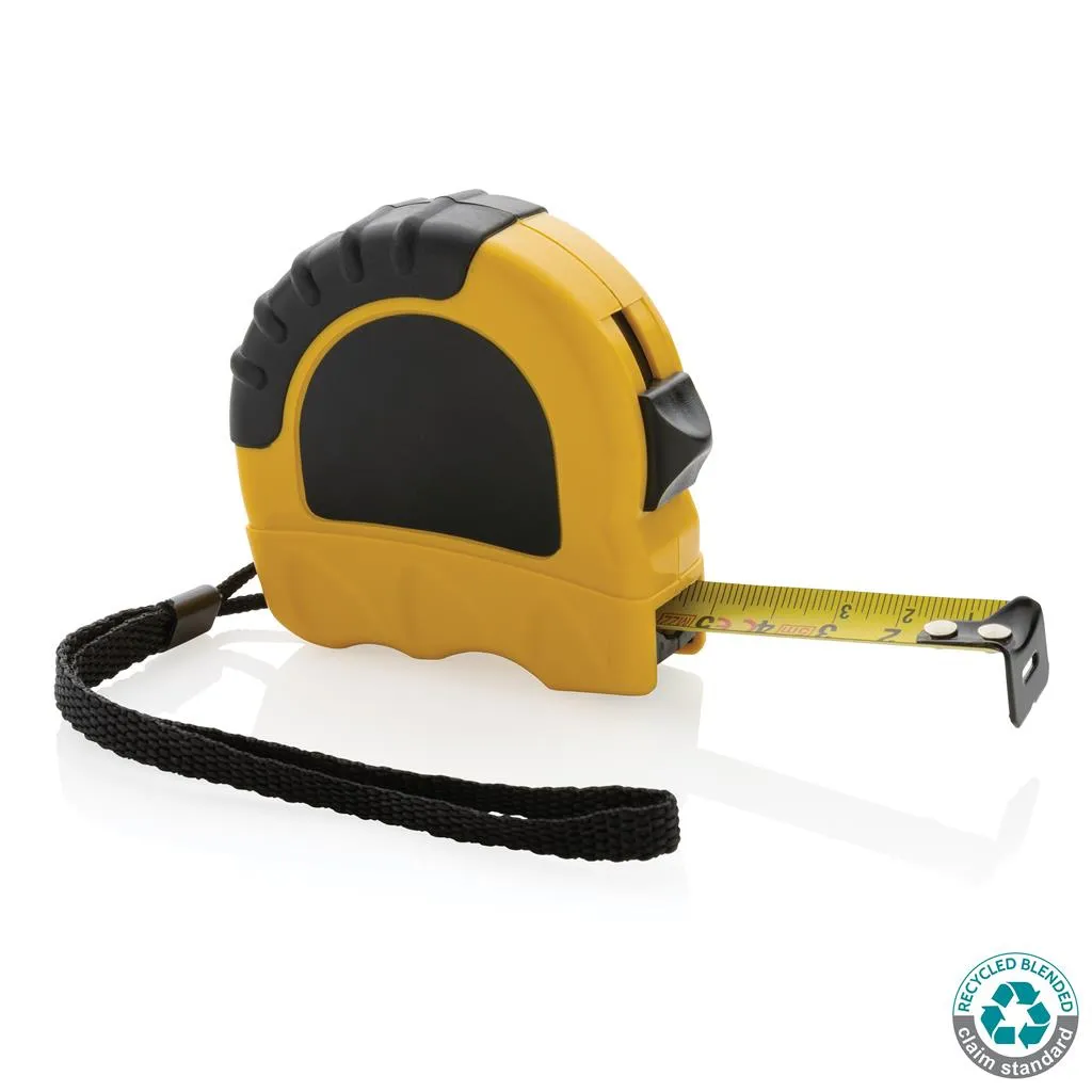 5 meter tape made with RCS (Recycled Claim Standard) certified recycled ABS. Total recycled content: 17% based on total item weight. RCS certification ensures a completely certified supply chain of the recycled materials. With deluxe TRP rubber grip for smooth grip. With release/lock button. With 19mm single sided tape yellow with black carbon steel hook. With polyester wrist strap. Packed in FSC® mix kraft packaging