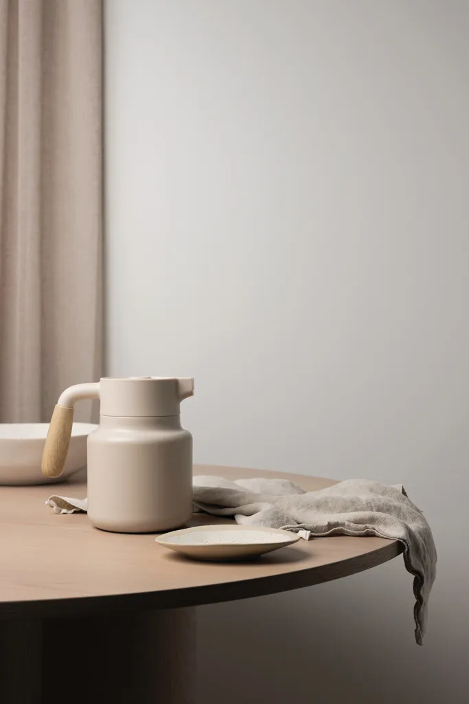 Keep your beverage warm or cold with this stylish vacuum jug made from RCS certified recycled stainless steel. With a capacity of 1200 ML. Both functional and elegantly designed, it complements any table setting. The lid features a convenient push button with a large opening for easy refilling and cleaning. The handle made from PP has an natural wood-like appearance. Easy to grip and pour from. This vacuum jug can keep drinks hot for up to 6 hours and cold for up to 24 hours. Handwash only. Not microwave safe. Certified by RCS (Recycled Claim Standard), RCS certification guarantees that the entire supply chain of recycled materials is certified. The total recycled content is based on the overall product weight. This product contains 62% RCS certified recycled stainless steel.