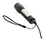 Aluminium flashlight with built-in USB rechargeable battery (400 mAh) and carry strap. With zoomable high power COB light at the font and COB floodlight on the side. With fixed and flashing light modes. Including USB charger cable.