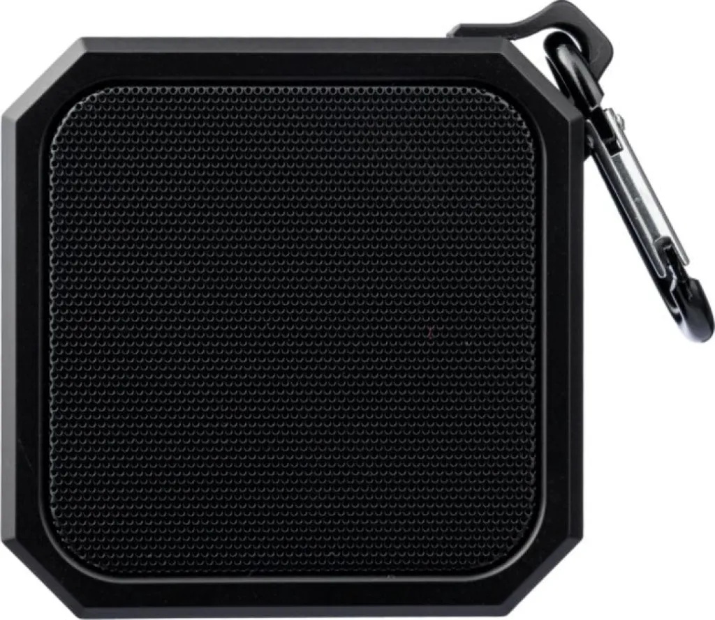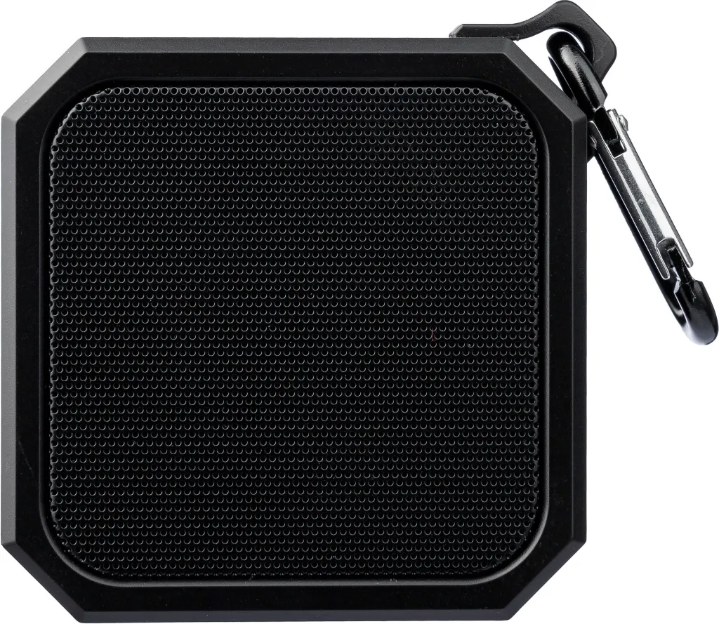 ABS speaker with carabiner and plastic clip. IPX4 rated. 3W output, DC 5V input, 300mAh built-in rechargeable battery, with 2 hours of playing time. Working distance of 15-20 meters, signal-to-noise ratio of 87 dB. Frequency range: 100 Hz to 20 kHz. Includes 50 cm Type-C charging cable. Wireless connection technology: 5.2. Individually packaged in a brown cardboard box.