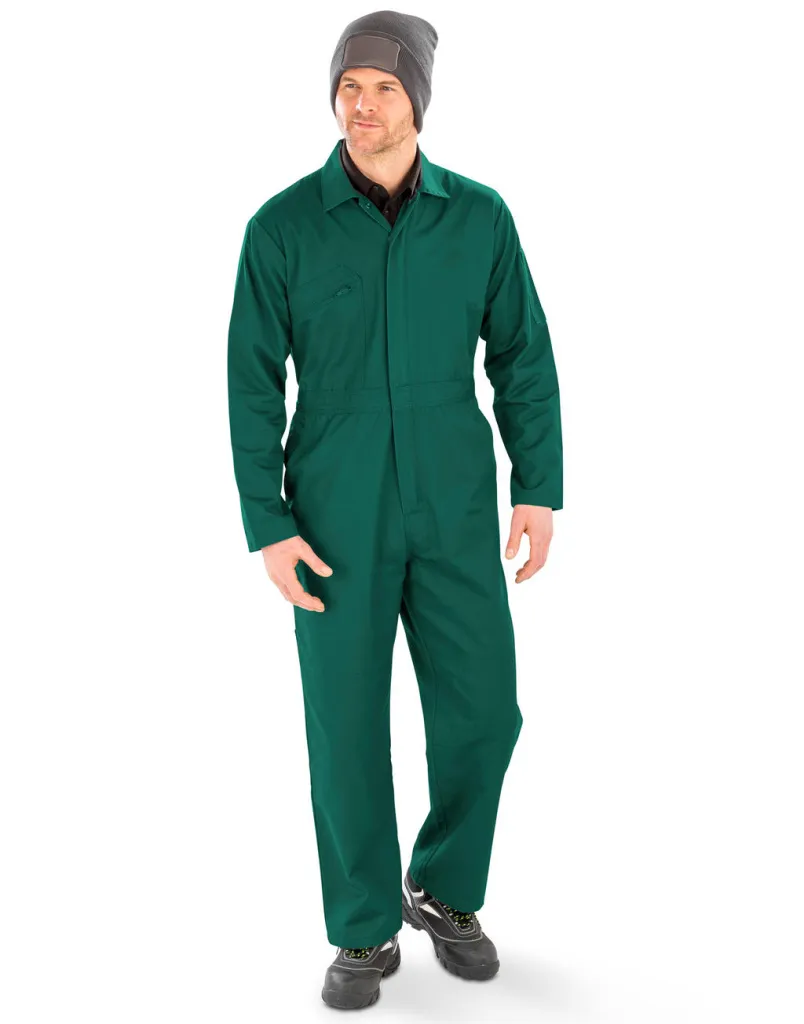 ·270 g/m² ·100% Polyester (Recycled, Twill) ·Recycled polyester from approx. 82 post-consumer bottles (TOPGREEN®) ·Unlined ·Stud fastened collar ·2-way YKK zip with outer storm flap ·Chest zip pocket, sleeve pen pocket, ruler pocket, hang loop ·Back elasticised waistband ·Hip pockets with wide side access, patch and zip back pockets ·Gusseted back panel, bar tack stress points ·Open cuffs and ankles ·End of life recyclable