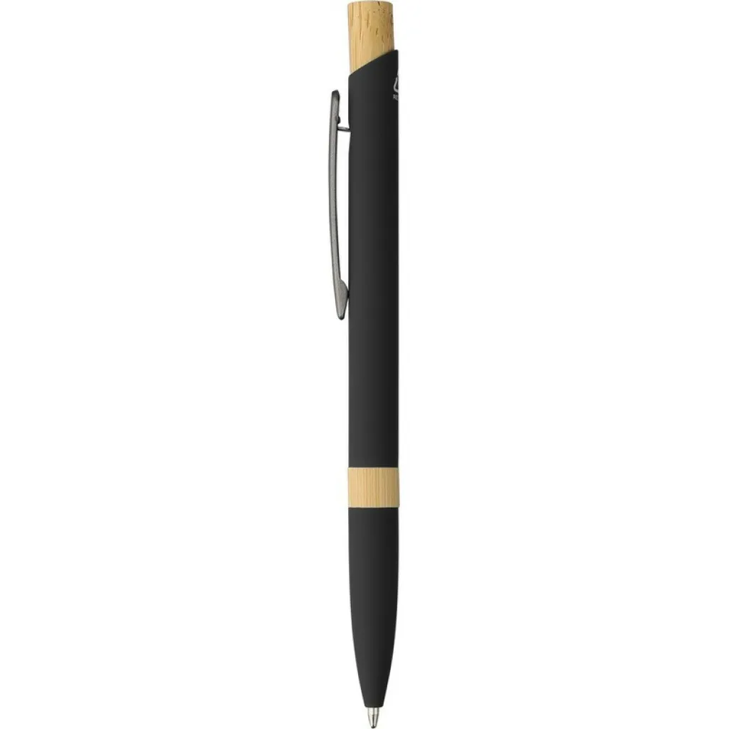 Recycled aluminium ball pen with a rubberized finish, bamboo pusher, bamboo ring in the body, features a push mechanism, 1.0 mm nib size, writes in blue with an approximate writing length of 800 meters, includes recycled aluminium icon on product