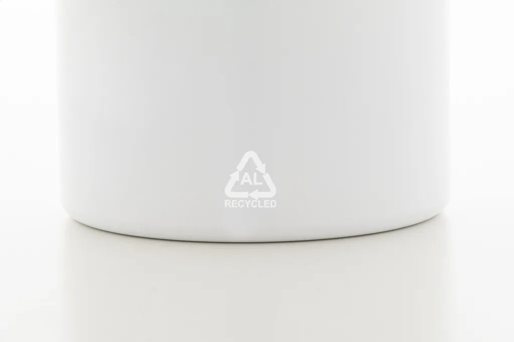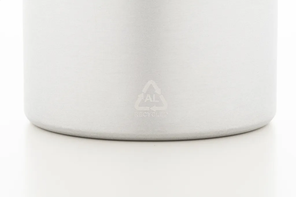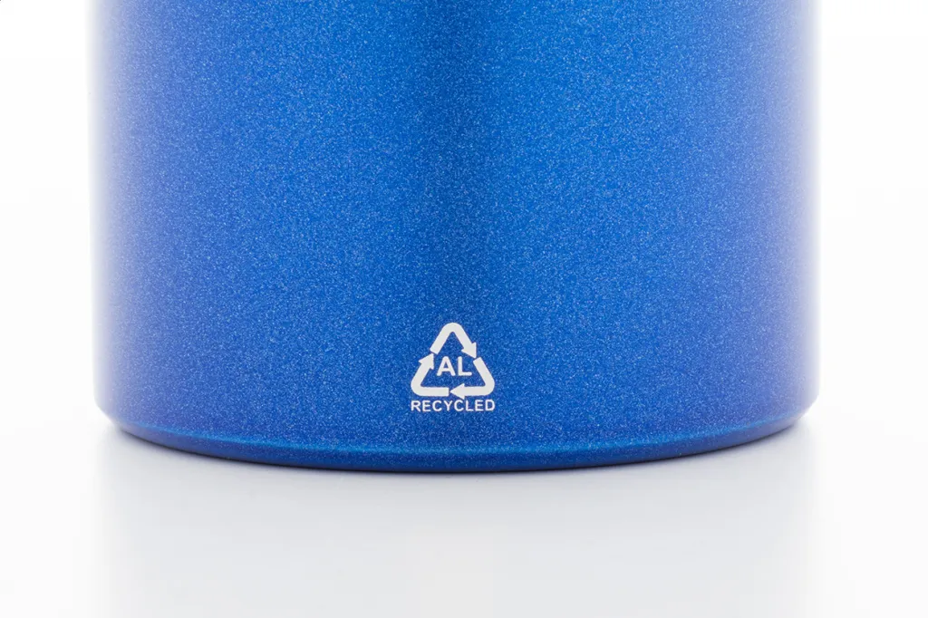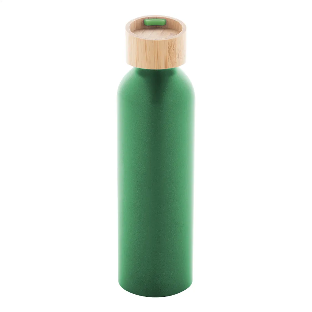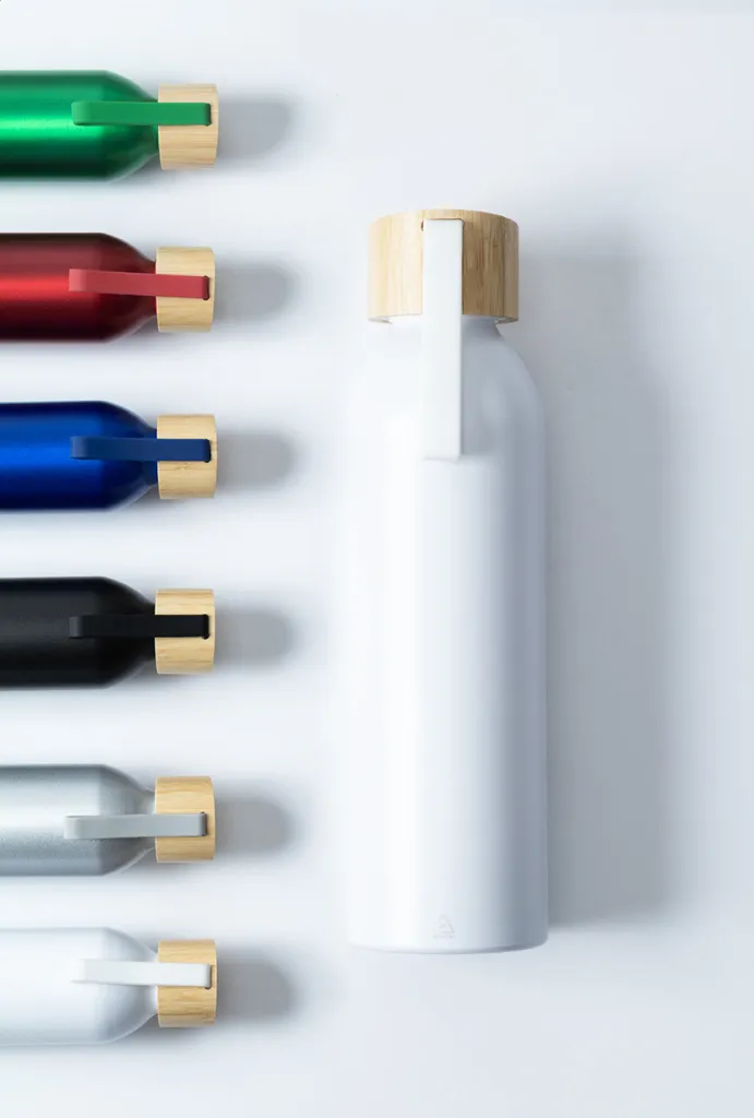 Recycled aluminium bottle with bamboo lid and matching colour silicone carry strap, 600 ml.
