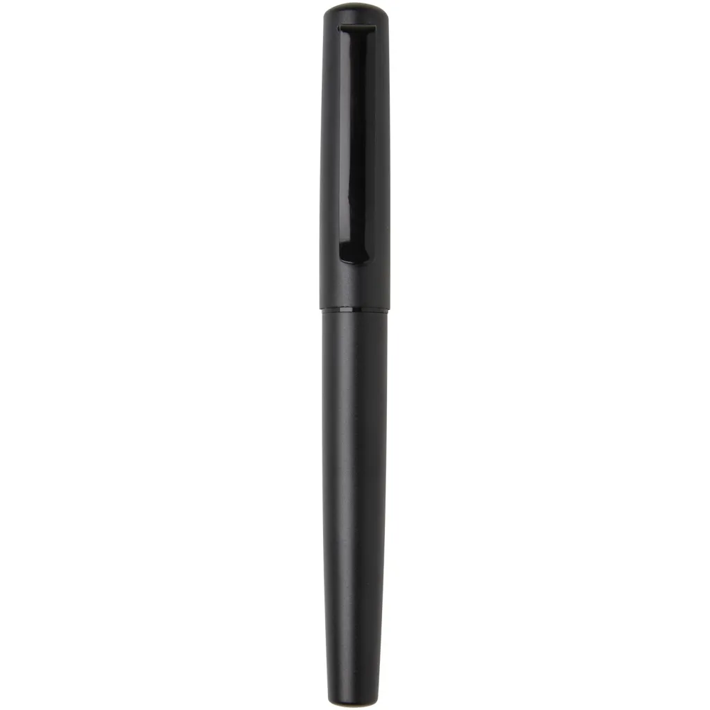 Fountain pen with a recycled aluminium barrel with matte black coating and a black recycled aluminium grip. Aluminium is a recyclable material and by choosing this pen, you can support more sustainable practices and give new life to discarded aluminium materials. This stylish fountain pen serves as a practical and more sustainable option for individuals and organisations looking for environmentally friendly writing instruments. Delivered with a black cartridge and a black gift box. Box size: 16.8 x 4.2 x 2.5 cm.