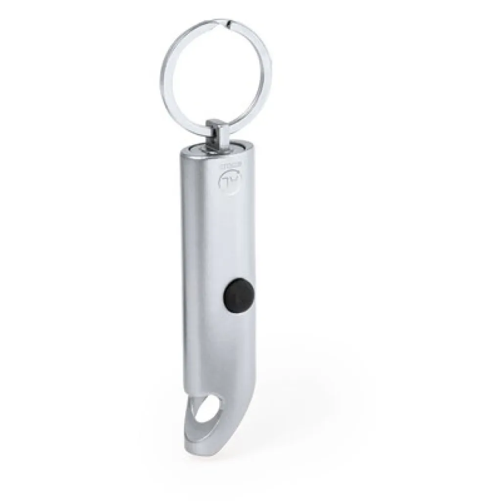 Keyring made from recycled aluminium, bottle opener, 3 LED, compliant with GRS (Global Recycled Standard) certificate.
